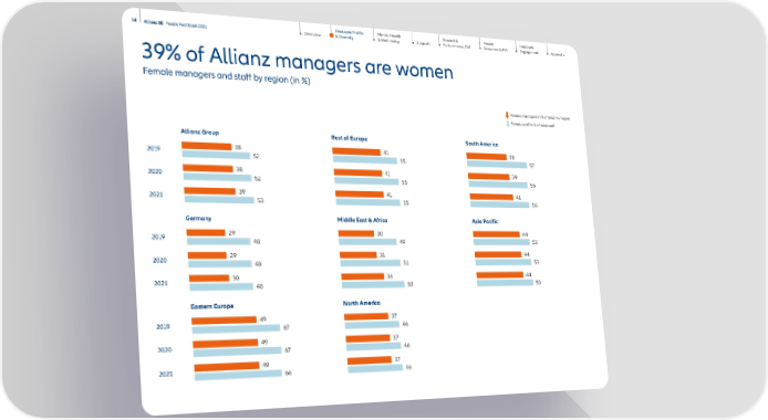 Mental Health & Well-being AllianzU Reward & Performance, GM Employee Engagement Appendix People Attraction & TM 14 Allianz SE People Fact Book 2021 Overview Employee Profile & Diversity 39% of Allianz managers are women Female managers and staff by region (in %) Female managers in % of total managers Female staff in % of total staff 2019 2020 29 48 29 48 53 44 31 51 49 30 53 44 2019 2020 49 67 46 37 49 67 46 37 2019 2020 38 52 55 41 56 39 38 52 55 41 57 38 Allianz Group Rest of Europe Middle East & Africa North America South America Asia Pacific Germany Eastern Europe 2021 2021 2021 39 53 30 48 49 66 55 41 46 37 56 41 53 44 36 53