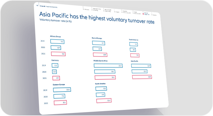 Employee Profile & Diversity Mental Health & Well-being AllianzU Reward & Performance, GM Appendix People Attraction & TM 50 Allianz SE People Fact Book 2021 Overview Employee Engagement Asia Pacific has the highest voluntary turnover rate Voluntary turnover rate (in %) 2019 2020 2019 2020 2019 2020 2021 Allianz Group Rest of Europe Middle East & Africa North America South America Asia Pacific Germany Eastern Europe 2021 2021 7. 8 8.6 12.0 3.0 4.9 4.3 9. 5 6.9 9.8 6.8 11.4 8.5 16.1 16.1 22.4 9.7 6.9 10.8 13.3 16.8 16.9 7. 0 4.9 7. 6