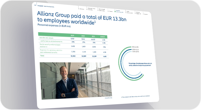 Employee Profile & Diversity Mental Health & Well-being AllianzU Employee Engagement Appendix People Attraction & TM 35 Allianz SE People Fact Book 2021 Overview Reward & Performance, GM Allianz Group paid a total of EUR 13.3bn to employees worldwide 1 Personnel expenses (in EUR mn) 2019 2020 2021 Δ 20/21 Salaries and wages 9,787 9,942 10,587 6.5% – performance-related elements 29% 27% 29% 2.0% Social security and employee assistance 1,435 1,439 1,553 7.9 % Expenses for pension and other post-retirement benefits 1,200 1,129 1,19 9 6.3% Total 12,422 12,509 13,339 6.6% 1) Figures based on all Allianz employees (core and non-core business). Percentage of employees whose salary is set by collective bargaining agreement 2021: 62.8% 2020: 62.1% 2019: 62 . 5% Allianz Germany