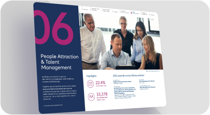 Employee Profile & Diversity Mental Health & Well-being AllianzU Reward & Performance, GM Employee Engagement Appendix 38 Allianz SE People Fact Book 2021 Overview People Attraction & TM People Attraction & Talent Management At Allianz, we care for tomorrow. We care for our employees, their ambitions, dreams and challenges. Together we can build an environment where everyone feels empowered and has the confidence to explore, to grow and to shape a better future for our customers and the world around us. Join us and together, let’s care for tomorrow. 06 Highlights Allianz Group Digital Communications Award Quadriga University Allianz Group 6x shortlisted for various awards for the development, communication and global roll-out of its new Employer Value Proposition Gartner Communications Award, 2x for TIARA Award, Trendence Award, HR Excellence Award, Symbiosis Employer Branding Award Allianz Life Best Workplaces for Women Fortune 500 Allianz Technology India Best Workplaces for Women Great Place To Work 2021 awards across Allianz entities 1 1) Only few selected awards listed. 22.4% recruitment rate 33,378 employees were hired in 2021 Allianz Real Estate GmbH, Munich