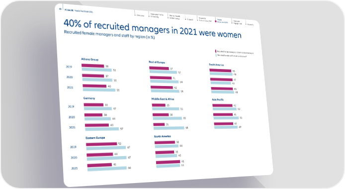 Employee Profile & Diversity Mental Health & Well-being AllianzU Reward & Performance, GM Employee Engagement Appendix 43 Allianz SE People Fact Book 2021 Overview People Attraction & TM 40% of recruited managers in 2021 were women Recruited female managers and staff by region (in %) Recruited female managers in % of recruited managers Recruited female staff in % of recruited staff 44 67 35 40 51 37 54 41 43 47 44 30 55 30 41 53 51 38 52 37 48 46 47 33 51 25 42 50 52 67 38 44 2019 2020 2019 2020 2019 2020 Allianz Group Rest of Europe Middle East & Africa North America South America Asia Pacific Germany Eastern Europe 2021 2021 2021 55 40 54 42 48 46 57 40 58 21 49 40 66 41 44 45