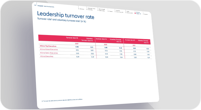 Employee Profile & Diversity Mental Health & Well-being AllianzU Reward & Performance, GM Appendix People Attraction & TM 53 Allianz SE People Fact Book 2021 Overview Employee Engagement Leadership turnover rate Turnover rate 1 and voluntary turnover rate 1 (in %) Turnover rate in % Voluntary Turnover rate in % Turnover rate in % Voluntary Turnover rate in % Turnover rate in % Voluntary Turnover rate in % 2019 2020 2021 Allianz Top Executives 0.40 0.21 0.40 0.18 0.43 0.21 Allianz Global Executives 0.01 0.00 0.01 0.01 0.01 0.00 Allianz Senior Executives 0.05 0.02 0.05 0.02 0.04 0.02 Allianz Executives 0.34 0.19 0.34 0.16 0.38 0.19 1) Turnover rate and voluntary turnover rate calculated based on total workforce.