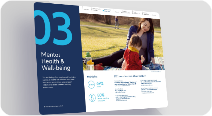 Employee Profile & Diversity AllianzU Reward & Performance, GM Employee Engagement Appendix People Attraction & TM 21 Allianz SE People Fact Book 2021 Overview Mental Health & Well-being Mental Health & Well-being The well-being of our employees is key to the success of Allianz. We advocate workplace health and we provide a wide range of initiatives to create a healthy working environment. 03 Highlights Allianz Technology Corporate Health Award “Excellence” seal and special prize “International” EuPD Research and Handelsblatt Allianz Spa (Italy) Top employer 2021 Top Employer Institute Allianz SE Singapore Branch HRD 5 Star Employer Award 2021, Employer of Choice 2021 HRD Asia (hcamag.com) Allianz Taiwan LH and Allianz Thailand HR Asia Best Companies To Work For In Asia Awards 2021 HR ASIA (hrasiamedia.com) Allianz Taiwan LH and Allianz Indonesia 2021 Top Insurance Employer Insurance Business Asia (insurancebusinessmag.com) 2021 awards across Allianz entities 1 1) Only few selected awards listed. 69% WWI+ 80% female part-time employees Allianz Services, Munich