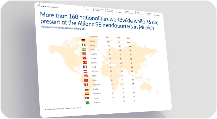 Mental Health & Well-being AllianzU Reward & Performance, GM Employee Engagement Appendix People Attraction & TM 20 Allianz SE People Fact Book 2021 Overview Employee Profile & Diversity More than 160 nationalities worldwide while 76 are present at the Allianz SE headquarters in Munich Most common nationalities at Allianz SE 1 Nationality 2019 2020 2021 German 886 946 1,247 Italian 52 56 69 Indian 27 39 49 American 36 39 43 Chinese 31 31 40 Spanish 22 23 38 French 33 33 35 Austrian 27 28 28 British 25 22 27 Turkish 15 20 24 Romanian 13 17 17 Russian 14 15 15 Colombian 15 10 14 Serbian 11 10 14 Brazilian 7 11 12 1) Excluding Allianz SE Singapore, Casablanca and Rome branch.