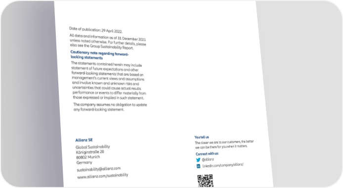 Date of publication: 29 April 2022. All data and information as of 31 December 2021 unless noted otherwise. For further details, please also see the Group Sustainability Report. Cautionary note regarding forward ‑ lo oking statements The statements contained herein may include statement of future expectations and other forward-looking statements that are based on management’s current views and assumptions and involve known and unknown risks and uncertainties that could cause actual results performance or events to differ materially from those expressed or implied in such statement. The company assumes no obligation to update any forward-looking statement. Allianz SE Global Sustainability Königinstraße 28 80802 Munich Germany [email protected] www.allianz.com/sustainability Copyright © 2022 Allianz SE. All rights reserved. You tell us The closer we are to our customers, the better we can be there for you when it matters. Connect with us: @allianz link edin.com/company/allianz/