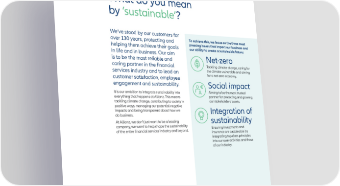 We’re evolving all the time... What do you mean by ‘sustainable’ ? 01 We’ve stood by our customers for over 130 years, protecting and helping them achieve their goals in life and in business. Our aim is to be the most reliable and caring partner in the financial services industry and to lead on customer satisfaction, employee engagement and sustainability. It is our ambition to integrate sustainability into everything that happens at Allianz. This means tackling climate change, contributing to society in positive ways, managing our potential negative impacts and being transparent about how we do business. At Allianz, we don’t just want to be a leading company, we want to help shape the sustainability of the entire financial services industry and beyond. About Allianz Net-zero Tackling climate change, caring for the climate-vulnerable and aiming for a net-zero economy. Social impact Aiming to be the most trusted partner for protecting and growing our stakeholders’ assets. Integration of sustainability Ensuring investments and insurance are sustainable by integrating top class principles into our own activities and those of our industry. Find out more about our sustainability approach and commitments. To achieve this, we focus on the three most pressing issues that impact our business and our ability to create a sustainable future: “ After 132 years in business, we never tire of working with others to find solutions to complex sustainability problems – and we will remain unsatisfied until we have found effective, institutionalized long-term solutions that make the world a better place.” Oliver Bäte Chairman of the Board Allianz SE Allianz Sustainability Fact Book Allianz Sustainability Fact Book