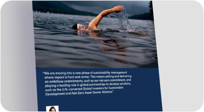 Building confidence in tomorrow... We’re working together with the Insurance Development Forum (IDF) to enable governments to better protect their populations against natural disasters. InsuResilience We’re working in partnership to provide climate risk insurance for up to 500 million people in the most vulnerable developing countries by 2025. Closing the protection gap We’re closing the protection gap by providing access to affordable microinsurance solutions in the emerging consumers sector. Emerging consumers in Africa, Asia and Latin America make up half of the world’s population and many of them are underinsured. “ We are moving into a new phase of sustainability management where impact is front and center. This means setting and delivering on ambitious commitments, such as our net-zero commitment, and playing a leading role in global partnerships to develop solutions, such as the U.N.-convened Global Investors for Sustainable Development and Net-Zero Asset Owner Alliance.” Line Hestvik Chief Sustainability Officer Allianz SE Creating sustainable products and solutions Sustainable products and solutions represent a significant business opportunity for us, and the chance to contribute to a better future. What do we mean by ‘sustainable products and solutions’? Sustainable insurance solutions directly support environmental and/or social issues such as renewable energy insurance or health insurance for vulnerable groups that would otherwise be excluded. Sustainable add-ons to standard insurance products encourage a positive impact e.g. a mileage-based discount on your car insurance or environmentally friendly repairs in case of a claim. Emerging consumer solutions such as affordable health insurance support customers entering the financial services markets for the first time. Sustainable investment solutions are for customers who want their money to do good, such as pensions that make it possible to invest in sustainable funds from our asset management business. 04 How do your products improve lives and the environment? € . bn revenue from sustainable solutions sustainable insurance and investment solutions on offer . mn emerging consumers reached with affordable and effective insurance solutions Allianz Sustainability Fact Book Allianz Sustainability Fact Book