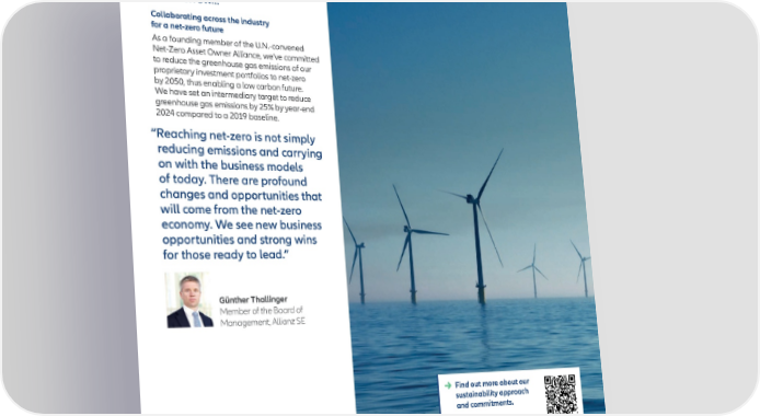 02 What are you doing about climate change? Tackling climate change “ Reaching net-zero is not simply reducing emissions and carrying on with the business models of today. There are profound changes and opportunities that will come from the net-zero economy. We see new business opportunities and strong wins for those ready to lead.” Günther Thallinger Member of the Board of Management, Allianz SE Building confidence in tomorrow... Collaborating across the industry for a net-zero future As a founding member of the U.N.-convened Net-Zero Asset Owner Alliance, we’ve committed to reduce the greenhouse gas emissions of our proprietary investment portfolios to net-zero by 2050, thus enabling a low carbon future. We have set an intermediary target to reduce greenhouse gas emissions by 25% by year-end 2024 compared to a 2019 baseline. % reduction of GHG emissions per employee (against 2019 baseline). % of our electricity came from renewable, low-carbon sources in 2021. Our goal is to reach 100% in 2023. 01 We anticipate the risks of a changing climate – looking to the future to protect people from climate change. We offer advice and encourage the companies we invest in to define and pursue their own climate strategies. As part of our long term view, we’ve stopped financing coal- based business models. They won’t feature at all in our investments and insurance activities by 2040 or sooner. 02 While all regions of the world are affected by climate change, some are hit harder than others. We care for the climate vulnerable and aim to close the protection gap in emerging countries. Many people still do not have insurance at all. We want to close this protection gap. This includes insuring farmers and supporting governments to protect more people from the impacts of climate change. We’re collaborating to provide access to climate risk insurance for up to 500 million people in the most vulnerable developing countries by 2025. 03 We enable a low-carbon future by targeting sustainable investments. As well as reducing our own emissions and using renewable energy, we develop sustainable products and services and lead the industry in insuring renewables and energy efficiency. We target investment towards renewable energy schemes, green buildings and bonds that support environmental projects. We are working with others to tackle climate change in three key ways: Find out more about our sustainability approach and commitments. Allianz Sustainability Fact Book Allianz Sustainability Fact Book