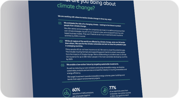 02 What are you doing about climate change? Tackling climate change “ Reaching net-zero is not simply reducing emissions and carrying on with the business models of today. There are profound changes and opportunities that will come from the net-zero economy. We see new business opportunities and strong wins for those ready to lead.” Günther Thallinger Member of the Board of Management, Allianz SE Building confidence in tomorrow... Collaborating across the industry for a net-zero future As a founding member of the U.N.-convened Net-Zero Asset Owner Alliance, we’ve committed to reduce the greenhouse gas emissions of our proprietary investment portfolios to net-zero by 2050, thus enabling a low carbon future. We have set an intermediary target to reduce greenhouse gas emissions by 25% by year-end 2024 compared to a 2019 baseline. % reduction of GHG emissions per employee (against 2019 baseline). % of our electricity came from renewable, low-carbon sources in 2021. Our goal is to reach 100% in 2023. 01 We anticipate the risks of a changing climate – looking to the future to protect people from climate change. We offer advice and encourage the companies we invest in to define and pursue their own climate strategies. As part of our long term view, we’ve stopped financing coal- based business models. They won’t feature at all in our investments and insurance activities by 2040 or sooner. 02 While all regions of the world are affected by climate change, some are hit harder than others. We care for the climate vulnerable and aim to close the protection gap in emerging countries. Many people still do not have insurance at all. We want to close this protection gap. This includes insuring farmers and supporting governments to protect more people from the impacts of climate change. We’re collaborating to provide access to climate risk insurance for up to 500 million people in the most vulnerable developing countries by 2025. 03 We enable a low-carbon future by targeting sustainable investments. As well as reducing our own emissions and using renewable energy, we develop sustainable products and services and lead the industry in insuring renewables and energy efficiency. We target investment towards renewable energy schemes, green buildings and bonds that support environmental projects. We are working with others to tackle climate change in three key ways: Find out more about our sustainability approach and commitments. Allianz Sustainability Fact Book Allianz Sustainability Fact Book