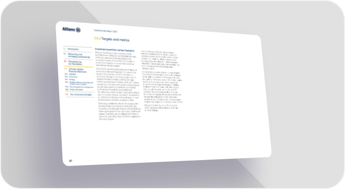 Sustainability Report 2021 04.6 Targets and metrics 01 Introduction Investment portfolio carbon footprint The past two years showed why we believe Both our listed equity and corporate bonds that both absolute and relative indicators are 02 Measuring and portfolio have undergone considerable changes necessary to measure the carbon performance managing sustainability in the two past years, characterized by the of portfolios. Relative indicators are sensitive economic impacts of the COVID-19 pandemic to changes in either direction in both company 03 Strengthening and the first impacts of our portfolio steering valuation and company sales, whereas absolute our foundation towards the climate targets. emissions are sensitive to strategic asset allocation shifts. 04 Climate-related Since 2019, we achieved a reduction of absolute It should also be noted that our current emission financial disclosure emissions of almost 25 percent. This was driven Scope is 1 and 2 and does not consider emissions 04.1 Highlights by four major factors: a COVID-19 effect on in the wider value chain of investees, which can 04.2 Governance emissions, change in company valuation which be significant for many sectors. While data quality 04.3 Strategy impacts the denominator, portfolio changes, for Scope 3 emissions is still low, there is merit 04.4 Strategy resilience, stress-tests and and structural emission reductions of our investee in sector-specific Scope 3 indicators and data climate scenario analysis companies. The latter is the real-economy change to determine if companies and their products 04.5 Risk and opportunity management we are seeking and it contributes significantly are on a pathway consistent with our 1.5°C 04.6 Targets and metrics to the emissions reductions we observed. ambition. We are working to develop these Our absolute carbon footprint may rebound next indicators also as part of our work with the AOA. 05 Our universal principles year to a certain extent, but what is important for We are also calling for harmonized carbon us is that the underlying structural trend is intact disclosure requirements across all three scopes and enables to achieve our target in 2025. of greenhouse gas emissions (see section 04.3.3). Sectorally, considerable shares of our equity and Please note that figures for financial year bond portfolios are invested in manufacturing 2020 have been restated due to a change companies. The absolute emissions of manufacturing in methodology. make up 45 percent of our emissions in both asset classes. Therefore, we also display NACE level 2 sectors for manufacturing to further disaggregate the sector figures. 87
