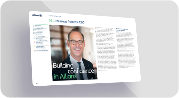 Sustainability Report 2021 01.1 Message from the CEO 01 Introduction Every day, Allianz strives to earn the trust placed Allianz made good progress in us by our stakeholders and honor the role on climate ambition 01.1 Message from the CEO our company plays in society by truly living our 01.2 Company description and strategy purpose: Allianz is here to secure your future. 2021 was another year where the climate 01.3 Our sustainability approach predictions of science manifested in reality: 01.4 Our social approach Having stepped up to meet the challenges affecting the world is heating too fast and is becoming 01.5 Our climate approach the course of our planet, I am pleased to say less resilient to more extreme weather in the form 01.6 Our sustainability that the broad range of Allianz’s sustainability of storms, floods, heat waves and forest fires. integration approach efforts was recognized by highly respected Recent events have redoubled focus on renewable 01.7 2021 Reporting highlights external observers and through rigorous rating energy, on the importance of solving the climate methodologies. To name only one example, crisis and on the pursuit of a net-zero world 02 Measuring and we received the top rating in the 2021 Dow Jones to which Allianz has committed as part of the managing sustainability Sustainability Index. net-zero objective of Paris Climate Agreement. 03 Strengthening Over the course of 2021, a year once again But decarbonization alone is not enough – our foundation dominated by the COVID-19 pandemic and its we must address the social issues emerging from ensuing economic implications for individuals and the net-zero transition particularly in view of rising 04 Climate-related communities, Allianz stood reliably at the side of energy and food prices, further exacerbated from financial disclosure our clients, our employees, and our shareholders. the invasion of Ukraine. In February 2022, when Russia invaded the For our Allianz investments, climate was again 05 Our universal principles democratic and independent nation of Ukraine, on top of the agenda: COP26 brought together we made clear that Allianz stands with the free governments and the industry on climate world. We stand with all people who believe in and regulation is increasingly focusing on the open and free societies, with all our employees, issue. Allianz believes public-private and peer and with all people affected by these events. partnerships are key to battle the climate To underscore our support, we immediately challenges. We chair the U.N.-convened Net-Zero earmarked donation funds totaling € 10 million Asset Owner Alliance (AOA), by far the largest for humanitarian needs and promised an initiative in terms of true commitments towards additional € 2.5 million to match our employees’ a net-zero environment. The AOA was prominent and tied agents’ donations. As of March 31st 2022, at COP26 as it is the first public-private and peer our employees and tied agents have personally alliance setting short-term (2025) targets for donated over € 1 million. The generosity of our the decarbonization of investments. Within this Building people is only rivalled by their ingenuity, which is context, Allianz in January 2021 announced apparent in a range of business solutions to help concrete targets for 2025. humanitarian efforts in the affected region and confidence neighboring countries. in Allianz 05