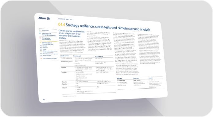 Sustainability Report 2021 04.4 Strategy resilience, stress-tests and climate scenario analysis 01 Introduction Climate change considerations from climate change, test our business strategy When we conduct analyses which assess 1.5°C Complementary bottom-up modeling for the most are an integral part of our and inform risk management and business scenario alignment, we adjust our scenario relevant exposures provides insights into climate 02 Measuring and decision making. selection using guidance developed by the AOA change risks at the level of individual investment managing sustainability insurance and investment We perform sensitivity and scenario analyses which is focused on 1.5°C scenarios with no or or underwriting projects and may support with time horizons up to 2050 and including low overshoot of 1.5°C of warming which limits contextualization of results from top-down 03 Strengthening strategy. scenarios ranging from 1.5°C to 4°C of average the need to remove GHG emissions from the analyses. This is showcased in the carbon price our foundation We apply various quantitative and qualitative warming by the end of the century. We make use atmosphere in the second half of the century. stress-test for listed equity and corporate bonds in approaches to carry out climate stress testing of internal models and external tools. While time When conducting outside-in impact scenario section 04.4.4, the inland flood risk case study for 04 Climate-related and scenario analysis in consideration of the long horizons naturally differ depending on the lines analysis, we use a broader range of scenarios real estate (see case study on page 80) and the financial disclosure time horizons over which climate change may of business under consideration, the range of in terms of temperature outcomes and analysis of inland flood and tropical cyclone risks 04.1 Highlights unfold and the high uncertainty over the direction scenarios we apply allows us to better assess the characteristics. Qualitative assessments are for property insurance liabilities in section 04.4.5. 04.2 Governance of future climate and economic developments. variety of risks and opportunities associated with conducted to explore to what extent and across Note that the analyses included in this report 04.3 Strategy Our objective is to foster risk awareness, build climate change. which channels climate change risks affect reflect our current approaches to climate change 04.4 Strategy resilience, stress-tests and expertise in the assessment of financial risks different aspects of our business, unconstrained risk assessments. Prevailing methodological and climate scenario analysis by the still limited availability of quantitative data limitations as well as the high degree of 04.5 Risk and opportunity management models. As an example, we report results from uncertainty inherent in any long-term analysis 04.6 Targets and metrics Aspects covered Scenarios used Scenario provider qualitative exposure screening for investments may still limit decision-usefulness of some results. 05 Our universal principles Transition and physical • Climate Biennial Exploratory Scenario Bank of England using a transition risk heat map in section 04.4.1 However, these approaches will change over time • General Insurance Stress-test 2019 and insights from a survey based assessment for as climate scenarios evolve in line with research, Transition and physical • Orderly Network for Greening the P&C retail business in section 04.4.2. developmental-stage methods improve further • Disorderly Financial System We deploy quantitative assessments for indicative and industry best-practices emerge. • Hot-house (for physical) sizing of our exposure to climate change risks. Transition • 53 scenarios used for Special Report Intergovernmental Panel on Climate A top-down approach is developed to assess risks on Global Warming of 1.5°C (no and Change (IPCC) (building on a multitude at the level of our balance sheet, in a first step low overshoot) of scenario providers) applying scenario data provided by the Bank Transition • Net-zero by 2050 International Energy Agency of England for the Climate Biennial Exploratory • Sustainable Development Scenario Scenario 2021 (CBES 2021) for the analysis of our investment portfolio presented in section 04.4.3. • Beyond 2˚ Scenario • Stated Policies Scenario Short-term Medium-term Long-term • 2° Scenario Transition • One Earth Climate Model University of Technology Sydney Up to three years Three – ten years Ten+ years Transition • RPS Inevitable Policy Response As defined, for instance, Needed for establishing As, for instance, required for • FPS in our standard Top Risk solvency considerations and strategic decisions and transactions Assessment process. capital adequacy. with investment horizons of Physical • RCP1 4.5 IPCC several decades like real estate • RCP1 8.5 and infrastructure. • RCP1 2.6 will be implemented in the course of 2022 1 Representative concentration pathway. 73