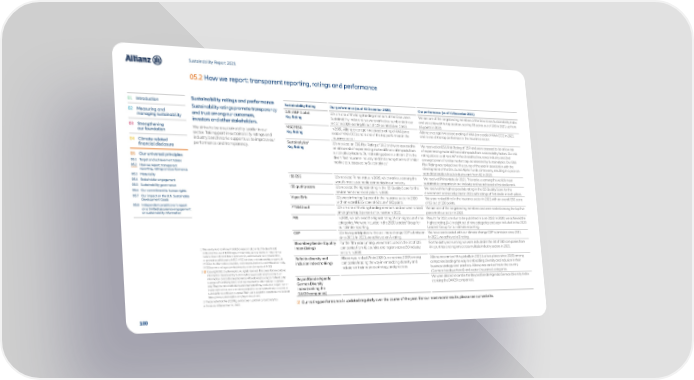 Sustainability Report 2021 05.2 How we report: transparent reporting, ratings and performance 01 Introduction Sustainability ratings and performance Sustainability Rating Our performance (as of 31 December 2020) Our performance (as of 31 December 2021) Sustainability ratings promote transparency DJSI/S&P Global We are one of the longstanding members of the Dow Jones We are one of the longstanding members of the Dow Jones Sustainability Index 02 Measuring and and trust among our customers, Key Rating Sustainability Index and we were ranked as number six in our and we achieved the top position, scoring 93 points out of 100 in 2021, up from managing sustainability investors and other stakeholders. sector in 2020, scoring 85 out of 100 points (Silver Class). 85 points in 2020. MSCI1 Allianz once again received a rating of AAA (on a scale of AAA-CCC) in 2021 03 Str engthening We strive to be a sustainability leader in our ESG In 2020, Allianz once again received a rating of AAA (on a our foundation Key Rating scale of AAA-CCC) and is one of the top performers in the and is one of the top performers in the insurance sector. sector. Taking part in sustainability ratings and insurance sector. industry benchmarks supports us to improve our 2 04 Climate-r elated performance and transparency. Sustainalytics We received an ESG Risk Rating of 16.2 and were assessed to We received an ESG Risk Rating of 15.9 and were assessed to be at low risk financial disclosure Key Rating be at low risk of experiencing material financial impacts from of experiencing material financial impacts from sustainability factors. Our risk 3 sustainability factors. Our risk rating places us at rank 2 in the rating places us at rank #7 in the diversified insurance industry and 2nd diversified insurance industry and 2nd amongst peers of similar market cap, as assessed by Sustainalytics. Our ESG 05 Our universal principles amongst peers of similar market cap, assessed by Sustainalytics.4 Risk Rating was revised over the course of the year in association with the 05.1 Target and achievement tables development of the Structured Alpha Funds controversy, resulting in a year-on- 05.2 How we report: transparent year deterioration in sub-industry rank from #2 in 2020. reporting, ratings and performance 05.3 Materiality ISS ESG We received Prime status in 2020, which ranks us among the We received Prime status in 2021. This ranks us among the world’s most 05.4 Stakeholder engagement world’s most sustainable companies in our industry. sustainable companies in our industry and we achieved a first decile rank. 05.5 Sustainability governance ISS quality score We received the highest rating in the ISS Quality Score for the We received the highest possible rating in the ISS Quality Score for the 05.6 Our commitment to human rights environment and social pillars in 2020. environment and social pillars in 2021 with ratings of first decile in both pillars. 05.7 Our impact on the U.N. Sustainable Vigeo Eiris We were in the top 5 percent in the insurance sector in 2020 We were ranked third in the insurance sector in 2021 with an overall ESG score Development Goals with an overall ESG score of 62 out of 100 points. of 63 out of 100 points. 05.8 Independent practitioner’s report FTSE4Good We are one of the longstanding members and we were ranked We are one of the longstanding members and were ranked among the top five on a limited assurance engagement among the top 8 percent of our sector in 2020. percent of our sector in 2021. on sustainability information PRI In 2020, we achieved the highest rating (A+) in eight out of nine Results for 2021 are due to be published in June 2022. In 2020, we achieved the categories. We were included in the 2020 Leaders’ Group for highest rating (A+) in eight out of nine categories and were included in the 2020 our climate reporting. Leaders’ Group for our climate reporting. CDP We have participated with our climate change CDP submission We have participated with our climate change CDP submission since 2011. since 2011. In 2020, we achieved an A- rating. In 2021, we achieved a B rating. Bloomberg Gender Equality For the fifth year running, we were included in the list of 325 For the sixth year running, we were included in the list of 380 companies from 1 The use by Allianz of any MSCI ESG research LLC or its affiliates (‘MSCI’) Index (listing) companies from 42 counties and regions across 50 industry 44 countries and regions across multiple industry sectors in 2021. data, and the use of MSCI logos, trademarks, service marks or index names sectors in 2020. herein, does not constitute a sponsorship, endorsement, recommendation, or promotion of Allianz by MSCI. MSCI services and data are the property of Refinitiv diversity and Allianz was ranked 7th in 2020 (up one since 2019) among Allianz was ranked fifth globally in 2021 (up two places since 2020) among MSCI or its information providers, and are provided as-is and without warranty. inclusion index (ranking) companies leading the way in embedding diversity and companies leading the way in embedding diversity and inclusion in their MSCI names and logos are trademarks or service marks of MSCI. inclusion in their business strategy and practices. business strategy and practices. Allianz was ranked first in the country 2 Copyright 2021 Sustainalytics. All rights reserved. This presentation contains information developed by Sustainalytics (www.sustainalytics.com). Such (German-headquartered) and sector (insurance) categories. information and data are proprietary of Sustainalytics and/or its third party BeyondGenderAgenda We were placed second in the BeyondGenderAgenda German Diversity Index suppliers (Third Party Data) and are provided for informational purposes only. They do not constitute an endorsement of any product or project, nor an German Diversity (ranking the DAX30 companies). investment advice and are not warranted to be complete, timely, accurate or