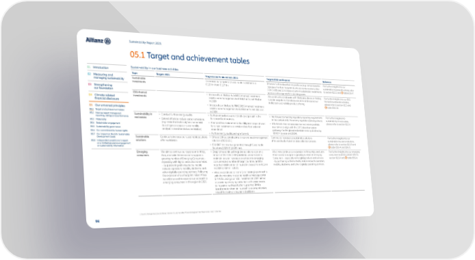 Sustainability Report 2021 05.1 Target and achievement tables 01 Introduction Sustainability in our business activities Topic Targets 2021 Progress and Achievements 2021 Targets 2022 and beyond Reference 02 Measuring and Sustainable Decreased our proprietary sustainable investments to Efforts to further decarbonize portfolios (e.g. compensate for For further insights into our managing sustainability investments € 123 bn from € 127 bn. increase of carbon footprint due to economic recovery after sustainable investments, please refer 03 Str engthening COVID-19) and to increase volume in sustainable investments to section 02.2.2 and table ESG-7. our foundation are top on the agenda for upcoming years. ESG-themed • Increased our third-party AGI ESG-themed investment We continue to collaborate with third party clients on finding For further insights into our ESG 04 Climate-r elated investments assets under management to € 184.3 bn from € 95.4 bn suitable bespoke sustainability solutions and expand our themed investments activities, financial disclosure in 2020. dedicated sustainability product offering. please refer to section 02.3 and • Increased our third-party PIMCO ESG-themed investment table ESG-13. 05 Our universal principles assets under management to € 203.1 bn from € 136.5 bn 05.1 Target and achievement tables in 2020. 05.2 How we report: transparent Sustainability in • Conduct further energy audits • Further embedded our sustainability approach in the • Work towards meeting regulatory reporting requirements For further insights into reporting, ratings and performance real estate • Extend efforts to reduce carbon emissions European Debt business. in the context of EU Taxonomy regulation (among others) sustainability in real estate, 05.3 Materiality (e.g. revise the technical/ environmental • Amended the environmental due diligence scope of work • Efforts to further decarbonize the real estate portfolio please refer to section 02.2.4. 05.4 Stakeholder engagement due diligence scope or sustainability for direct investments to consider decarbonization in (our aim is to align with the 1.5°C decarbonization 05.5 Sustainability governance analysis in investment documentation) more detail. pathways for the global real estate sector published by 05.6 Our commitment to human rights • Further energy audits were performed. CRREM by year-end 2024). 05.7 Our impact on the U.N. Sustainable Sustainable Continue to increase our sustainable solutions • Offered 339 sustainable insurance and asset management Continue to increase our sustainable solutions For further insights into our Development Goals 05.8 Independent practitioner’s report solutions offer worldwide. solutions (2020: 231). offer worldwide. Automize data collection process. sustainable insurance solutions, on a limited assurance engagement • € 1,484.7 mn revenue generated through Sustainable please refer to section 02.1.5 and on sustainability information Solutions (2020: € 1,448.9 mn). table ESG-4 and ESG-5. Emerging We aim to continue our expansion in Africa, • Despite the continued negative social and economic We aim to continue our expansion in Africa, Asia, and Latin For further insights into our emerging consumers Asia, and Latin America and to support a impact of the COVID-19 pandemic, we were able to America and to support a growing number of Emerging consumers business, please refer to growing number of Emerging Consumers – maintain or even increase our outreach to emerging Consumers – especially with digital products and services section 02.1.4 and table ESG-6. especially with digital products and services consumers in a number of target countries, and the – by partnering with insurtechs, mobile network operators, – by partnering with insurtechs, mobile reported total number of insured increased from 46.1mn mobility platforms, and other digitally operating partners. network operators, mobility platforms, and in 2020 to 62mn1 in 2021. other digitally operating partners. Following • We also continued to intensify our strategic partnership the extension of our footprint in East Africa, with the microinsurance and health services specialist we will also seek to expand our outreach to BIMA: Following our initial investment in 2017, aimed emerging consumers in this region in 2021. at providing emerging consumers with easier access to insurance, we have further supported BIMA’s transformation from an insurtech to a comprehensive HealthTech with an insurance backbone. 1 Due to change in scope, additional 15.5mn insured reported from Indian government-sponsored health schemes. 94