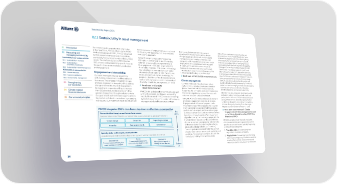 Sustainability Report 2021 02.3 Sustainability in asset management 01 Introduction For investors seeking greater ESG orientation by the outcomes of engagements and are linked leverage and balance sheet management AllianzGI also continues to support global net- in their portfolios, PIMCO offers a suite of ESG- to the proxy voting process to form a consistent as well as ESG-related topics such as climate zero ambitions via its Private Markets platform. 02 Measuring and dedicated solutions. In 2021, PIMCO enhanced stewardship approach. change targets and ESG bonds, human capital In November, together with IFC and Hong Kong managing sustainability its ESG research frameworks and capabilities, With 299 company engagements covering management, and board qualifications and Monetary Authority, AllianzGI set up the world’s Sustainability in our business activities particularly for municipal bonds and securitized 482 topics in 238 companies and 27 markets, composition. Of the 1,585 corporate bond issuers first cross-sectoral portfolio of emerging-market 02.1 Sustainability in insurance assets. The platform builds on PIMCO’s core AllianzGI showcased its strong commitment engaged, more than 650 issuers were engaged loans aligned with the Paris Agreement called the 02.2 Sustainability in ESG process and sustainability-specific features to engagement in 2021 and voted at 10,190 in depth, with repeat discussions on specific Managed Co-Lending Portfolio Program (MCPP proprietary investments focused in three areas: exclusions, evaluation, shareholder meetings. In 68 percent of meetings topics and milestones monitored and tracked. One Planet). The strategy supports the IFC and 02.3 Sustainability in asset management and engagement. they voted against management, withheld or These issuers represent almost 60 percent of the Allianz Group to make 1.5°C-aligned investments Sustainability in our organization Engagement and stewardship abstained with at least one vote. These figures firm’s corporate holdings by market value. in emerging markets. AllianzGI also announced at 02.4 Human resources reflect AllianzGI’s willingness to vote against Read more in PIMCO’s ESG Investment report. the U.N. Climate Conference in Glasgow the launch 02.5 Customer satisfaction Our asset managers engage proactively proposals that do not meet its expectations as of the Emerging Market Climate Action strategy 02.6 Environmental management with investee companies to build sustainable well as fulfilling its duty to act in the interests of Climate engagement (EMCA), a public-private partnership, which will businesses. They engage in regular dialogue clients by considering each proposal on merit. Our asset managers have developed robust invest in climate-focused private equity funds and 03 Strengthening and seek to present a viewpoint, effect positive Read more in AllianzGI’s methods to incorporate climate considerations projects active in emerging markets and developing our foundation change and monitor results of engagement. stewardship statement. into our investment decisions and processes. countries with a focus on climate mitigation, By investing in corporates willing to improve Supporting the companies we invest in to develop climate adaptation, and access to electricity. 04 Climate-related their ESG practices, we believe we can drive PIMCO’s 80+ global credit research team engaged their transition pathways is one of the ways with AllianzGI has also enhanced its company-wide financial disclosure greater change than through exclusions alone. with 1,585 corporate bond issuers representing which we broaden our positive impact. exclusions policy, including a dedicated coal 05 Our universal principles Our goal is both to find the best opportunities in roughly 80 percent of PIMCO’s corporate holdings policy for the first time. This enhanced exclusion the market and also to create them by engaging by market value. Topics of discussion with company Last year, AllianzGI introduced a specific element policy effective from December 2021, further with issuers. Our investment views are influenced management related to corporate strategy, of climate engagement related to its ‘Climate underlines AllianzGI’s commitment to tackling Engagement with Outcome’ program. Under climate change by divesting from the single the program, in portfolios applying the program largest source of carbon emissions – coal. PIMCO integrates ESG factors from a top down and bottom up perspective the highest emitters are identified, their climate Read more about AllianzGI’s Climate Top profiles are fully scoped, and it seeks to engage Engagement with Outcome approach as well Themes identified through annual Secular Forum process down with these companies to understand their climate as the Private Market launches, MCPP One Speakers include Nobel Prize winners, heads of state, renowned academics, global central bankers transition pathway towards a Paris Agreement Planet and EMCA. aligned economy. It will actively engage with the Climate change Geopolitics Corporate governance highest emitters (Scopes 1 and 2) on ambitious PIMCO’s broad climate research evaluates climate ‘outcomes’ encompassing not only scale climate-related risks and opportunities within Inequality Demographic trends Cybersecurity of decarbonization, but also how this is being specific sectors and issuers, typically beginning achieved (and aligned with Just Transition). with two broad categories: These targets are considered within the context 1. Transition risks: for example tighter Specialty desks, credit analysts, security selection of sector and peers to ensure both credibility and Understanding all material risks is critical to making sound investment decisions, for example: ambition. The approach combines this with the regulations on carbon emissions. Social firm’s Sustainability Minimum Exclusions. 2. Physical risks: for example how the rising Environment Ensures 
