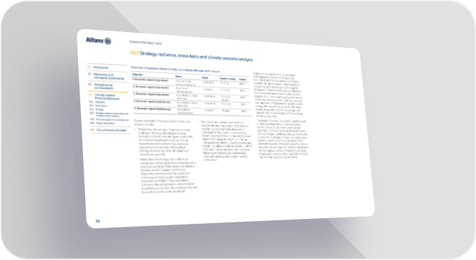 Sustainability Report 2021 04.4 Strategy resilience, stress-tests and climate scenario analysis 01 Introduction Overview of business-related climate risk analyses disclosed in this report Subject matter experts from across Allianz Technology and the Allianz Group assess 02 Measuring and Objective Name Scope Aspects covered Chapter each identified threat for relevance to Allianz, managing sustainability 1. Economic impacts (top-down) Qualitative risk Investments Transition 04.4.1 establish ratings for impact and probability of exposure screening occurrence, and define high-level mitigation 03 Strengthening 2. Economic impacts (top-down) Qualitative Insurance Transition 04.4.2 strategies. Climate-related issues considered in our foundation risk assessment the most recent assessment included adverse 3. Economic impacts (top-down) Quantitative climate Investments Transition, 04.4.3 impacts from increasing frequency and severity 04 Climate-related stress-test physical of extreme weather events on Allianz premises, financial disclosure 4. Economic impacts (bottom-up) Quantitative carbon Investments Transition 04.4.4 consequences of heatwaves on operations and 04.1 Highlights stress-test energy efficiency of data centers under rising 04.2 Governance 5. Economic impacts (bottom-up) Quantitative Insurance Physical 04.4.5 temperatures, and potential challenges with 04.3 Strategy risk assessment regard to the implementation of future energy 04.4 Strategy resilience, stress-tests and efficiency regulation. climate scenario analysis The threat of business disruptions and damaged 04.5 Risk and opportunity management Further examples of the application of scenario • For our business operations, threats as a or destroyed assets due to extreme weather 04.6 Targets and metrics analysis include: result of climate change and other extreme events already exists under current climate 05 Our universal principles • Prospective and existing infrastructure assets weather related events are assessed on conditions. Further increase of this threat due to undergo a thorough due diligence along a forward-looking basis via an emerging climate change is addressed through review and evaluation criteria, considering an asset’s GHG threat assessment that is conducted between update of risk mitigation measures and business emissions and potential impact on capital Allianz Technology and the Allianz Group. continuity and disaster recovery plans. Other expenditures and performance. Assets are This assessment aims to identify top emerging defined mitigation strategies targeted to mid- or required to have a clear and time-lined threats, including interdependencies, and the long-term issues range from developing solutions strategy showing how they will adapt to a definition of potential mitigation strategies, for managing data center load and cooling at decarbonizing world. following a multi-step process involving temperature peaks to designing implementation external market research, expert reviews concepts for regulatory requirements. • Allianz Real Estate regularly conducts an and surveys. energy and carbon performance overview of its direct real estate portfolio, including indicative decarbonization targets. Furthermore, Allianz Real Estate piloted the application of in-house climate scenario analysis for investment portfolios. This work builds on internal underwriting tools to assess location- based physical climate risks and paves the way to use them on the asset side as well. 74