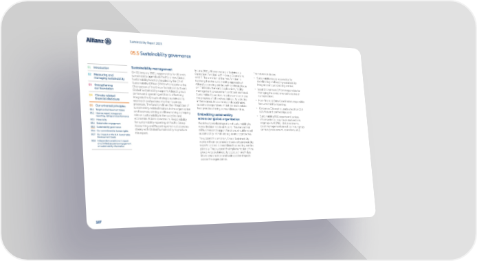 Sustainability Report 2021 05.5 Sustainability governance 01 Introduction Sustainability management In June 2021, Allianz created a Sustainable The network includes: On 01 January 2021, responsibility for Allianz’s Operations function within Group Operations • Sustainability Leads responsible for 02 Measuring and sustainability agenda shifted to a new Global and IT. The ambition of the new function is coordinating and leading sustainability managing sustainability Sustainability function, headed by the Chief to strengthen the sustainability approach of integration in our operating entities; Sustainability Officer (CSO) who reports to the Allianz’s operating entities with a primary focus 03 Str engthening Chairperson of the Group Sustainability Board. on IT infrastructure and applications, facility • Local Environment Officers responsible for our foundation Global Sustainability supports Allianz’s group management, procurement and business travel. managing the environmental footprint of centers and operating entities to effectively Sustainable Operations monitors and promotes our operations; 04 Climate-r elated integrate the Group’s strategic sustainability the progress of Allianz’s sustainability activities • Non-Financial Data Coordinators responsible financial disclosure approach and policies into their business in these areas. It also steers and coordinates for sustainability reporting; processes. The function drives the integration of sustainable operations initiatives and enables • Corporate Citizenship Leads who drive CSR 05 Our universal principles sustainability-related matters in the organization best practice sharing across Allianz entities. activities and partnerships; and 05.1 Target and achievement tables and business, aiming at Allianz taking a shaping Embedding sustainability 05.2 How we report: transparent role on sustainability in the societies and • Sustainability/ESG experts and centers reporting, ratings and performance economies Allianz operates in. Responsibility across our global organization of competence in our business functions 05.3 Materiality for sustainability reporting shifted to Group We strive towards integration of sustainability in at group-level (P&C, L&H, investments, 05.4 Stakeholder engagement Accounting and Reporting which collaborates every decision made at Allianz. This means that asset management) as well as in our group 05.5 Sustainability governance closely with Global Sustainability to produce all business and support functions, should embed centers (procurement, operations, etc.). 05.6 Our commitment to human rights this report. sustainability in their strategies and approaches. 05.7 Our impact on the U.N. Sustainable Development Goals To support this ambition, Group Sustainability 05.8 Independent practitioner’s report works with an expansive network of sustainability on a limited assurance engagement experts located across Allianz’s operating entities on sustainability information globally. They support the implementation of the group-wide sustainability approach and helps share best practice and scale positive impacts across the organization. 107
