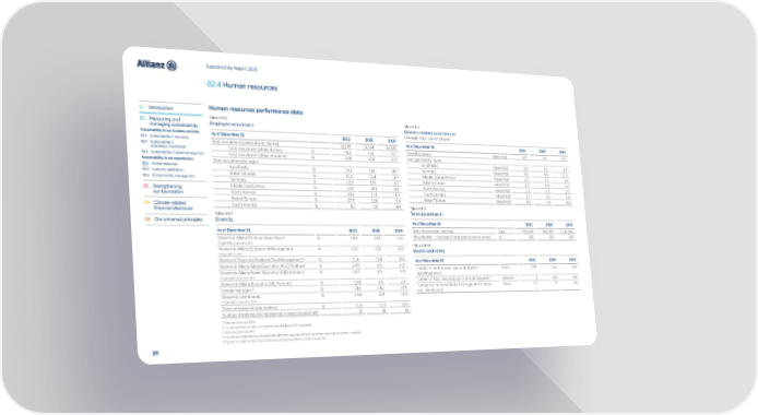 Sustainability Report 2021 02.4 Human resources 01 Introduction Human resources performance data 02 Measuring and Table HR-6 Table HR-8 managing sustainability Employee recruitment Sickness-related absenteeism Sustainability in our business activities average days per employee As of December 31 2021 2020 2019 02.1 Sustainability in insurance Total recruitment (external and internal) 33,378 19,564 24,829 As of December 31 2021 2020 2019 02.2 Sustainability in Overall average days/empl 6.9 6.9 8.1 proprietary investments Total recruitment (share of men) % 46.2 49.6 49.7 02.3 Sustainability in asset management Total recruitment (share of women) % 53.8 50.4 50.3 Average days by region Sustainability in our organization Total recruitment by region Asia Pacific days/empl 3.0 3.0 3.9 02.4 Human resources Asia Pacific % 24.0 23.0 28.7 Germany days/empl 9.4 9.6 11.5 02.5 Customer satisfaction Eastern Europe % 11.0 10.4 12.7 Middle East and Africa days/empl 2.7 2.5 3.6 02.6 Environmental management Germany % 32.3 10.9 10.0 Eastern Europe days/empl 5.5 5.8 6.8 03 Strengthening Middle East & Africa % 23.6 18.1 33.0 North America days/empl 1.3 1.3 2.0 our foundation North America % 15.6 11.1 15.4 South America days/empl 1.7 2.2 3.0 Rest of Europe % 17.5 12.4 19.1 Rest of Europe days/empl 8.2 7.8 8.6 04 Climate-related South America % 8.1 6.0 14.4 Table HR-9 financial disclosure Total absenteeism Table HR-7 05 Our universal principles Diversity As of December 31 2021 2020 2019 As of December 31 2021 2020 2019 Total absenteeism lost days days 993,348 981,093 1,110,896 1 Absenteeism – coverage of employees (core business) % 100 100 100 Women in Allianz SE Supervisory Board % 33.3 33.3 n/a Target 30% by year-end 2021 Table HR-10 Women in Allianz SE Board of Management % 20.0 20.0 20.0 Health and safety Target 30% by 2021 2 Women in Executive Positions (Top Management) % 31.6 30.4 29.9 As of December 31 2021 2020 2019 3 Women in Allianz Global Executive (AGE) Positions % 24.5 n/a n/a Number of work related injuries during the cases 578 n/a n/a 3 Women in Allianz Senior Executive (ASE) Positions % 24.7 n/a n/a 3 Target 30% by year-end 2021 reporting period 3 3 Number of fatal occupational injuries during work persons 1 n/a n/a Women in Allianz Executive (AE) Positions % 32.8 n/a n/a 4 Numbers of hours worked on average of a full-time hours 7.7 7.7 n/a Female managers % 38.6 38.2 37.9 equivalent (core) Women in talent pools % 43.4 42.3 40.2 Target 40% by year-end 2021 Share of women in core business % 51.6 51.3 51.3 5 Number of nationalities represented in executive positions 67 59 64 1 Data disclosed since 2020. 2 Includes women in all executive positions below the Board of Management. 3 Data disclosed since 2021. 4 Includes women functionally responsible for other staff, regardless of level, e.g. division, department and team managers. 5 Figures calculated by including all executive positions below the Board of Management. 39