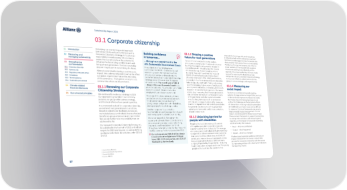 Sustainability Report 2021 03.1 Corporate citizenship 01 Introduction Underlying our overarching social approach 03.1.2 Shaping a positive exposed shortcomings, risks, and inequalities 4 (see section 01.4), we have further evolved its Building confidence future for next generations in education both within and across countries. 02 Measuring and Corporate Citizenship Strategy, to fully live our in tomorrow… We have provided opportunities for people with managing sustainability responsibility towards society. We are deeply Today’s children and youth are the leaders, disabilities for many years. Now, as a Worldwide aware that our actions have the potential to … through our commitment to the employees, customers, and investors of tomorrow Paralympic Partner, we became one of the 13 03 Strengthening influence the future living conditions and well- U.N. Sustainable Development Goals but they face significant barriers to inclusion in Iconic Leaders of The Valuable 500, a global our foundation being of next generations. Our decisions today A key objective of our strategy is our a world beset with inequality and the impacts movement working to put disability on the 03.1 Corporate citizenship play an integral part in determining this future. commitment to SDG 8 – Decent work and of climate change. A recent study by Allianz agenda of business leadership. We have made 03.2 Cybersecurity Allianz is committed to having a positive social economic growth. We harness the efforts Economic Research1 found that the impact of support for people with disabilities a main 03.3 Regulatory and public affairs impact. We understand social impact as the effect of our global entities and accelerate the COVID-19 on the future outcomes for Gen Z component of our Corporate Citizenship Strategy 03.4 Compliance our global organization has on the well-being implementation of our Corporate Citizenship (those born between 1995– 2010) are immense, to focus our efforts to unlock barriers for this 03.5 Tax transparency of the community – from global society to local Strategy, we will focus on specific aspects especially in four focus areas of SDG 8: education, group in a more strategic and impactful way. 03.6 Sustainable procurement communities where we live and work. of decent work: The overall goal of SDG 8 labor, inequality, and health. Particularly striking – Decent Work and Economic Growth is to was the increasing high number of youths not in 03.1.4 Measuring our 04 Climate-related 03.1.1 Renewing our Corporate promote sustained, inclusive, and sustainable employment, education, and training (NEET) with social impact financial disclosure Citizenship Strategy economic growth, full and productive knock-on impacts for the longer term. We have a employment, and decent work for all. role to play in ensuring that the next generations To drive our contribution towards creating 05 Our universal principles We continued to evolve our strategy in 2021. can overcome the economic and social impacts systemic change across our target SDGs, we must Our approach is grounded in our company The target 8.5 is about achieving full and of the pandemic and other systematic social understand and improve the impact we create. purpose, our group-wide business strategy, productive employment and decent work risks. Our long-term approach as an investor But measuring and managing impact is not and the local efforts of our operating entities. for all women and men, including for and insurer is an opportunity to offer measures without its challenges, as the long-term effects young people and persons with disabilities, that can mitigate future risks and shape societies of interventions involving multiple stakeholders In our renewed outlook for corporate citizenship, and equal pay for work of equal value. for generations, for example through pension and addressing complex issues can be difficult we centered next generations in our actions. Another target we focus on is 8.6 – systems, environmental and climate protection, to measure. Common frameworks can serve to Based on stakeholder feedback we received, Substantially reduce the proportion of youth education and more. improve social impact measurement. For this we included people with disabilities as a focused not in employment, education, or training. reason, we developed the Allianz Social Impact beneficiary group where we as an organization 03.1.3 Unlocking barriers for Measurement Framework to support local entities feel we can further take responsibility than we We act on target 8.10 (Strengthen the in setting their ambitions and measuring and addressed so far. capacity of domestic financial institutions to people with disabilities reporting on the impact of corporate citizenship Our renewed Corporate Citizenship Strategy will encourage and expand access to banking, People with disabilities make up 15 percent activities locally. We measure: be published in the first half of 2022 and will set insurance, and financial services for all, of the global population; one billion people through our emerging consumer business and experience some form of disability.2 On average • Input – what we contributed targets for 2022 and beyond, as well as defining InsuResilience partnership (see section 02.1). • Output – what happened guidance and criteria for activities under SDGs 8 as a group, people with disabilities are more likely and 13. Our actions around SDG 8 will be closely to experience adverse socioeconomic outcomes • Impact – what has changed linked to the other lighthouse SDGs we than persons without disabilities. As COVID-19 We developed separate guidance and tools on have, SDG 13 Climate Action, and SDG 17 continues to have wide-reaching impacts across impact measurement to create a robust data Partnerships for the Goals. the globe, people with disabilities have been process for corporate citizenship activities across uniquely impacted by the pandemic – including our operat