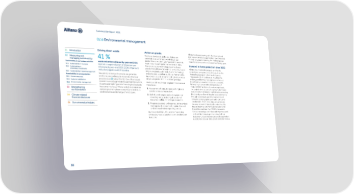 Sustainability Report 2021 02.6 Environmental management 01 Introduction Driving down waste Action on plastic Allianz is also partnering with the international We have developed global guidelines on marine conservation organization, Sea Shepherd 02 Measuring and 41 % systematically working towards single use Global, to support cleaning the Mediterranean managing sustainability plastic free operations. We have introduced this Sea of plastic waste from abandoned fishing gear. Sustainability in our business activities waste reduction achieved by year-end 2021 topic in our reporting for the first time in 2021. Invested in forest protection since 2012 02.1 Sustainability in insurance against a target reduction of 10 percent per For example, AZ Technology has introduced 02.2 Sustainability in employee by year-end 2025 (2020: 29 percent plastic-free offices which aim to completely avoid Allianz has invested in projects to offset its proprietary investments reduction) against a 2019 baseline. single-use plastics within all Allianz Technology operational emissions since 2013, such as the 02.3 Sustainability in asset management We aim to minimize the waste we generate branches and subsidiaries. Allianz Partners also Rimba Raya project in Borneo, Indonesia. Sustainability in our organization and to re-use and recycle materials wherever launched a plastic reduction initiative to remove This area is rich in biodiversity including the 02.4 Human resources possible (see table ENV-8). Our office-based single-use plastic from all entities’ premises. endangered Bornean orangutan and was at 02.5 Customer satisfaction operations mostly generate household-type waste, We have defined ‘Action on plastic’ measures at risk of being converted into palm oil estates. 02.6 Environmental management in particular tackling waste from single use plastic three levels: By helping to prevent the deforestation of has come into focus. Waste reduction awareness nearly 65,000 hectares of peat swamp forest, 03 Strengthening campaigns are in place across Allianz entities to 1. Assessment of baseline usage of single use the project aims to avoid more than 130 million our foundation address behavioral change of employees. plastic across our operations. tons of carbon emissions in addition to protecting 2. Definition of targets and action plans per biodiversity and benefiting the local community 04 Climate-related operating entity, including allocation of through local revenues and construction of financial disclosure resources and launch of implementation. renewable energy plants, a health clinic and 05 Our universal principles two libraries. The Rimba Raya project meets 3. Progress assessed and reported to the project the requirement of standards under the UN’s management sponsor, action plan checked Reducing Emissions from Deforestation and and reviewed within reporting period. Forest Degradation Plus (REDD+) program. By the end of 2021, 67 percent of operating Emissions savings are independently measured entities (by headcount) had completed at least and certified once a year. As a result of our level one. investment, we retired carbon credits equivalent to 138,746 t CO e in 2021 (2020: 203,352 t CO e). 2 2 55