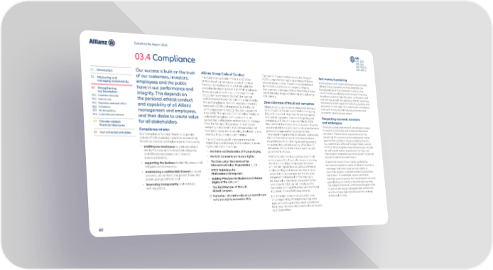 Sustainability Report 2021 GRI GRI 205 GRI 206 GRI 102-16 03.4 Compliance GRI 205-2 01 Introduction Our success is built on the trust Allianz Group Code of Conduct The new CoC was rolled out across the Group in Anti-money laundering of our customers, investors, The Allianz Group Code of Conduct (CoC) is 2021 along with training for operating entities to In accordance with applicable legal requirements, 02 Measuring and at the core of our corporate culture. It outlines raise awareness about the principles established Allianz Group operating entities establish risk- managing sustainability employees and the public the basic principles and values that guide the by the CoC, namely mutual respect, integrity, based policies and procedures to prevent the have in our performance and everyday decisions and conduct of all employees. transparency and responsibility. Operating entities risk of money laundering and terrorism financing 03 Strengthening Every new joiner to Allianz is informed of their are in the early stages of planning and delivering based on customer identification, verification and our foundation integrity. This depends on obligation to adhere to the CoC during their this training. monitoring, as well as suspicious activity reporting. 03.1 Corporate citizenship the personal ethical conduct welcome presentation. As part of a project led by Zero tolerance of fraud and corruption We employ screening and monitoring systems and 03.2 Cybersecurity Group Compliance, the CoC was fundamentally Allianz takes a zero-tolerance approach to fraud processes to manage risks and ensure compliance 03.3 Regulatory and public affairs and capability of all Allianz renewed in 2020 and approved by the Board and corruption. We are committed to complying with anti-money laundering requirements and 03.4 Compliance management and employees, of Management to replace the previous version fully with local and international anti-corruption economic sanctions restrictions. 03.5 Tax transparency from 2006. The updated CoC considers feedback and anti-bribery laws. Our aim is to go beyond Respecting economic sanctions 03.6 Sustainable procurement and their desire to create value collected from global employees on value complying with the minimum standards of the for all stakeholders. perception and includes an introductory message law, such that the Allianz Anti-Corruption Program and embargoes 04 Climate-related from the Group’s CEO, a clear link to the new We have global policies and procedures in place financial disclosure company purpose and relevant topics beyond sets standards for a consistent and comprehensive to ensure compliance with trade and financial Compliance mission traditional compliance including feedback culture, group-wide approach in every jurisdiction. sanctions. These include requirements for the 05 Our universal principles Our Compliance function fosters a corporate diversity, inclusion and sustainability. The program requires that employees and certain screening of customer and counterparty names culture of individual and collective responsibility The CoC expresses Allianz’s commitment to third parties with whom Allianz does business against the sanctions lists provided by the U.N., for ethical conduct and adherence to the rules by: respecting a wide range of international human are prohibited from offering, accepting, paying E.U. and the U.S. Office of Foreign Assets Control • enabling our employees to understand and rights standards including: or authorizing any bribe or any other form of (OFAC). Allianz’s global requirements also include live by the rules and oversee that adequate corruption, be it with the private sector or with an enhanced review requirement for high-risk and effective processes are in place to • the Universal Declaration of Human Rights; government officials. transactions related to countries, sectors or parties ensure adherence; • the U.N. Covenants on Human Rights; Anti-Corruption training is compulsory for all subject to sanctions restrictions. • supporting the business to identify, assess and • The Core Labor Standards of the employees with online and classroom training Due to the nature of our clients’ underlying mitigate compliance risks; International Labor Organization (ILO); delivered in multiple languages. To ensure business transactions, some of Allianz’s insurance online trainings achieve acceptable levels of coverage and other business can relate to • maintaining a confidential channel to report • OECD Guidelines for understanding and awareness, they include concerns, act on them and protect those who Multinational Enterprises; a mandatory test component that must be countries, sectors or parties subject to sanctions speak up in good faith; and • Guiding Principles for Business and Human completed and passed for the training to restrictions. For example, where permitted, Rights of the U.N.; and be deemed to have been completed by the we may issue insurance for humanitarian services • interacting transparently and truthfully employee. In 2022, we will introduce Anti- provided by our clients in sanctioned countries. with regulators. • The Ten Principles of the U.N. Corruption training KPIs in line with the World The Allianz Sanctions Compliance Program aims Global Compact. Economic Forum (WEF) requirements. to ensure we respect all applicable restrictions F or further information about our commitment and that these high-risk transactions undergo to human rights, see section 05.6. No material violations of corruption laws enhanced scrutiny. or corresponding official proceedings were reported to Group in 2021 which would have been required to be disclosed to Allianz Group’s Audit Committee. 62