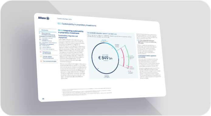 Sustainability Report 2021 02.2 Sustainability in proprietary investments 01 Introduction 02.2.1 Integrating sustainability Due to a change in the timings, the PRI results for in proprietary investments Our sustainability integration approach as an asset owner 2021 reporting are due in June 2022. Please see 02 Measuring and This is a simplified visualization of our sustainability integration approach across our proprietary investment our latest PRI assessment results from 2020 in the managing sustainability Sustainability integration and portfolio and asset classes (illustration not to scale). Allianz Sustainability Report 2020. Sustainability in our business activities engagement Our latest and past PRI Transparency 02.1 Sustainability in insurance Sustainability integration is fundamental to our € 212 bn Reports can be found on our profile on the 02.2 Sustainability in Non-listed investments PRI website. proprietary investments investment processes to ensure we consider risks 3 in 02.3 Sustainability in asset management and opportunities that extend beyond traditional € 12 bn We have invested more than € 849 billion Sustainability in our organization investment considerations. Integration of Sstainable a wide range of asset classes (2020: € 835 bn). sustainability across our proprietary investments is investments We systematically integrate sustainability 02.4 Human resources 2 considerations across our entire investment 02.5 Customer satisfaction steered by Allianz Investment Management (AIM) globally across all portfolios, regions and asset portfolio2 and enhance and deepen 02.6 Environmental management our approach, which is comprised of the classes. AIM is the main group-wide investment 03 Strengthening management function for proprietary assets. following elements: our foundation It works closely with Global Sustainability and Global AZ Portfolio € 11 bn 1. Asset manager selection, appointment with our internal asset managers, PIMCO and 89 nvestments €it‚ and monitoring 04 Climate-related Allianz Global Investors (AllianzGI), to develop 1 Environmental financial disclosure investment-related approaches such as € 849 bn obƒectives As an asset owner committed to the PRI and a the coal phase-out plan and sustainable ESG Screened founding member of the U.N.-convened Net- 05 Our universal principles investment strategies. Zero Asset Owner Alliance, our position on We are committed to the Principles for Responsible sustainability and our climate ambitions are clear; it is critical for the insurance industry to support Investment (PRI) and are part of a U.N.-supported 1 real world decarbonization in line with 1.5°C. international network of investors working together 1 € 12 bn to promote the incorporation of sustainability into nvestments €it‚ Our portfolio goals cannot be achieved without Social obƒectives the close collaboration and support of asset investment decision-making. The PRI guide our € 1 bn managers. We select and appoint asset managers approach to responsible investment and drive nvestments €it‚ that align their activities with our long-term continuous improvement across our businesses. E„S obƒectives interest in limiting climate change. To support In addition to the disclosures contained in this this, we have defined minimum expectations and report, we report annually to the PRI as an € 6 bn asset owner.1 isted investments systematic engagement and monitoring practices for asset managers. 1 Allianz SE and Allianz Investment Management SE jointly prepare Allianz’s disclosure to the PRI as an asset owner, while AllianzGI and PIMCO each prepare a PRI Report as asset managers. 2 Sustainability integration processes and coverage vary by asset class and between the type of portfolio and mandate. Minimum standards for sustainability integration are in place for covering all investments through the Allianz sustainability Functional Rule for Investments. 3 Figures based on economic view. Compared to accounting view it reflects a volume increase due to switch from book to market values and changed asset scope (e.g. including For Valuation Only (FVO), trading and real estate own-use). 25