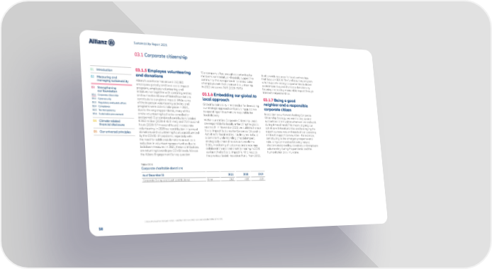 Sustainability Report 2021 03.1 Corporate citizenship 01 Introduction 03.1.5 Employee volunteering ‘Our company offers enough opportunities for it will provide resources for local partnerships and donations me to environmentally and socially support the that focus on SDG 8. The fund is our key program 02 Measuring and community that we operate in’ as an indicator which supports strategic opportunities to deliver managing sustainability Allianz’s workforce has around 150,000 of employee satisfaction around volunteering. social impact beyond charitable donations by employees globally and local social impact In 2021 we scored 76 % (2020: 78 %). focusing on creating measurable impact through 03 Strengthening programs, employee volunteering and intersectoral partnerships. our foundation initiatives run together with operating entities 03.1.6 Embedding our global to 03.1 Corporate citizenship and our twelve Allianz-affiliated foundations local approach 03.1.7 Being a good 03.2 Cybersecurity contribute to our global impact. While some neighbor and a responsible 03.3 Regulatory and public affairs of the in-person volunteering activities and Global Sustainability is responsible for developing corporate citizen 03.4 Compliance programs were able to take place in 2021, our strategic approach and providing guidance 03.5 Tax transparency due to the ongoing pandemic, many of the to operating entities that are responsible for In addition to our forward-looking Corporate 03.6 Sustainable procurement onsite volunteering had to be cancelled or local delivery. Citizenship Strategy, we want to step up and postponed. Our combined contributions totaled Within our entities, Corporate Citizenship Leads support our communities where we live and work 1 mn); and 73 thousand 04 Climate-related € 28.2 million (2020: € 43.5 are responsible for locally embedding the global during times of need. This means aligning our financial disclosure hours (2020: 57 thousand hours) in corporate approach. In November 2021, we published a new activities with local priorities and leveraging the volunteering. In 2020 our contribution in terms of Social Impact Guidance for Corporate Citizenship expertise, resources, and assets of our operating 05 Our universal principles donations and volunteering hours was influenced Activities for local entities. It is designed to build entities to support communities – for example, by the COVID-19 pandemic, especially with a consistent understanding of social impact, contributing to the emergency response and the need for additional donations as well as a strategically channel resources towards the rebuilding communities following natural reduction in volunteering opportunities due to SDGs, monitoring of outcomes and encourage disasters and providing donations and employee lockdown measures. In 2021, these contributions collaboration and best practice sharing. In 2021 volunteering during the pandemic and the are returning towards pre-COVID levels. We use we launched a Social Impact Fund to replace humanitarian crisis in Ukraine. the Allianz Engagement Survey question: the previous Social Innovation Fund. From 2022, Table CC-1 Corporate charitable donations As of December 31 2021 2020 2019 1 1 Corporate Giving total (cash contributions) € mn 28.2 43.5 21.5 1 Basis of calculation changed in 2021 – data from 2019 and 2020 have been adjusted to the same basis. 58