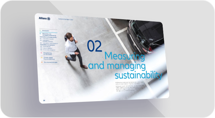 Sustainability Report 2021 01 Introduction 02 Measuring and managing sustainability Sustainability in our business activities 02.1 Sustainability in insurance 02.2 Sustainability in proprietary investments 02.3 Sustainability in asset management Sustainability in our organization 02.4 Human resources 02.5 Customer satisfaction 02.6 Environmental management 02 03 Strengthening our foundation 04 Climate-related Measuring financial disclosure 05 Our universal principles and managing sustainability In this section, we are covering material topics, public targets and commitments that are integrated across Allianz. In this year’s report – for the first time – we have combined all material topics for which we have established quantitative targets, KPIs and performance data, as well as the relevant managed approaches into one section. 14