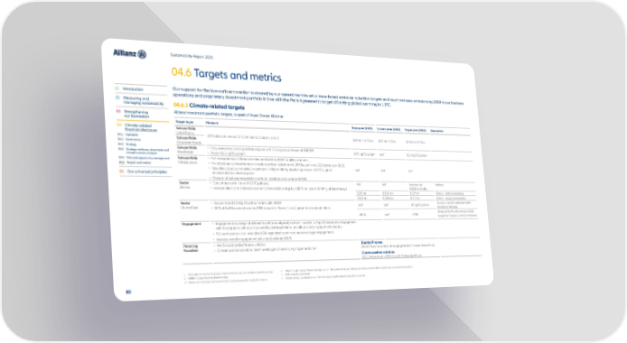 Sustainability Report 2021 04.6 Targets and metrics 01 Introduction Our support for the low-carbon transition is steered by our commitment to set science-based emission reduction targets and reach net-zero emissions by 2050 in our business operations and proprietary investment portfolio in line with the Paris Agreement’s target of limiting global warming to 1.5°C. 02 Measuring and managing sustainability 04.6.1 Climate-related targets 03 Strengthening Allianz investment portfolio targets, as part of Asset Owner Alliance our foundation Target layer Measure Base year (2019) Current year (2021) Target year (2024) Description 04 Climate-related Sub-portfolio financial disclosure Listed Equity -25 % absolute owned GHG emissions, Scopes 1 and 2 24.9mn t of CO e1 18.7 mn t CO e 18.7mn t of CO e 04.1 Highlights Sub-portfolio 2 2 2 04.2 Governance Corporate Bonds 04.3 Strategy 2 Sub-portfolio • Fully owned real estate portfolio aligned with 1.5 degree pathways of CRREM 67.5 kgCO e/sqm n/a3* 52.2 kgCO e/sqm 04.4 Strategy resilience, stress-tests and Real Estate • Reach 52.2 kgCO e/sqm2 2 2 climate scenario analysis 2 04.5 Risk and opportunity management Sub-portfolio • Full transparency on financed emissions latest by 2023 for all investments 04.6 Targets and metrics Infrastructure • For direct equity investments an absolute carbon reduction of -28 % by year-end 2025 (base year 2020) • New direct (equity and debt) investments in high emitting assets only in case a 1.5°C aligned n/a* n/a* n/a* 05 Our universal principles decarbonization plans in place • Phase in of net-zero targets for new fund investments by year-end 2024 Sector • Coal phase out in line with 1.5°C pathway n/a n/a* increase by Indirect Utilities 4 5.85% annually • Increase direct and indirect exposure to renewable energy by 5.85 % per year (IRENA global pathway) € 2.9 bn € 3.14 bn € 3.9 bn Direct – debt renewables € 4.3 bn € 3.88 bn € 5.7 bn Direct – equity renewables Sector • Scopes 1 and 2 20 kgCO 5 6 2e/boe in line with OGCI n/a* n/a* 20 kgCO e/boe Scopes 1 and 2 upstream GHG Oil and Gas • 50 % of AuM to set net-zero by 2050 targets for Scope 1 and 2 greenhouse gas emissions 2 emissions intensity ~40 % n/a* ~50% Share of AuM with net-zero 2050 target for Scopes 1 and 2 emissions Engagement • Engagement coverage of at least Top 30 (non-aligned) emitters in portfolio. Top 30 means new engagement with 8 companies, others are covered by existing bilateral or collaborative engagements already • Full participation in all available AOA organized sector and asset manager engagements • Increase overall engagement activities by at least 100 % Financing • 4 to 5 new blended finance vehicles Blended Finance: Transition • Climate-positive solutions: Start investing into Forestry, Hydrogen and other 2020: Africa Grow 2021: Emerging Market Climate Action Fund Climate-positive solutions: 2021: Investment in BTG Core US Timberland Fund 1 CO2e refers to carbon dioxide equivalent, which includes CO2 and other greenhouse gases. 4 IRENA: The International Renewables Agency is an intergovernmental organization supporting countries in their transition to a sustainable energy future. 2 CRREM: Carbon Risk Real Estate Monitor. 5 BOE: barrel of oil equivalent. 3* Where n/a is displayed most recent and/or comprehensive data is not yet available. 6 OGCI: Oil & Gas Climate Initiative; a CEO-led consortium of industry leading O&G companies. 85