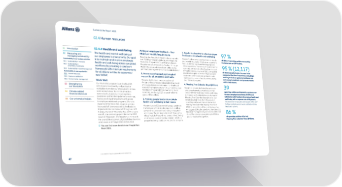 Sustainability Report 2021 02.4 Human resources 01 Introduction 02.4.4 Health and well-being Acting on employee feedback – four 3. Regular touch points to collect employee The health and mental well-being of Minimum Health Requirements feedback on their health and well-being 97 % 02 Measuring and our employees is a top priority. Our goal Based on the New Work Model pulse survey with We ask for direct employee feedback on health of Allianz’ operating entities successfully managing sustainability over 7,800 participants globally, we merged the and mental well-being initiatives on a quarterly implemented an EAP hotline. Sustainability in our business activities is to maintain and improve employee Work Well Program into four Minimum Health basis to identify needs and take appropriate 02.1 Sustainability in insurance health and well-being across our global Requirements to drive action. The four Minimum follow-up actions. The minimum requirement for 02.2 Sustainability in workforce by providing a consistent Health Requirements have been added to the operating entities is to collect feedback as part 95 % (12,117) proprietary investments 1 framework with minimum requirements pan-European agreement on work-related stress. of regular pulse surveys as of 2021. Our global of Allianz people leaders in scope have 02.3 Sustainability in asset management ambition is to gain more than 90 percent EAP completed the #lead experience, including a Sustainability in our organization for all Allianz entities to support our 1. Access to professional psychological awareness and 70 percent satisfaction with 02.4 Human resources new WOW. support for all employees worldwide feedback channels on health and well-being training module on personal resilience and 02.5 Customer satisfaction over the next two years. well-being to maintain and promote health 02.6 Environmental management Work Well We provide 24-hours anonymous, free-of- within their teams. charge professional psychological hotlines to all 4. Meeting Free Calendar Days @Allianz 03 Strengthening Our Work Well program, launched in 2015, employees to seek expert support and advice if our foundation aims to provide a healthy and productive needed. The implementation of such an Employee We aim to provide dedicated focus time for 39 workplace to enable our employees to reduce Assistance Program (EAP) is mandatory for all employees to simply concentrate on their operating entities participated in a pulse survey 04 Climate-related work-related stress. Ten minimum actions operating entities by 2022 as specified in the tasks and their health and mental well-being to assess employee awareness of EAPs and financial disclosure were rolled-out globally, including stress- global HR standard. to manage work-related stressors by regular satisfaction with feedback channels on health and awareness and leadership behavior trainings, Meeting Free Calendar Days @Allianz. Our well-being with a response rate of 49 percent. 05 Our universal principles flexible working arrangements and access 2. Training people leaders to maintain ambition is that more than 70 percent of to employee assistance programs. Efforts to health and well-being in their teams operating entities will have implemented 75 percent of employees were aware of the EAP implement the Work Well program globally Meeting Free Calendar Days by the end of hotlines and 64 percent were satisfied with the have paid off, demonstrated by feedback on We aim to train 100 percent of people leaders in 2022. As recognition of the contribution of our feedback options. implementation as measured through our AES. the first year of their leadership role to build up employees during the pandemic, the Allianz SE In 2021, the Work Well Index Plus (WWi+) score personal resilience and well-being among their Board of Management granted one additional was 69, one percentage point below the 2020 employees. The training is delivered through the day off for all employees globally in 2021 as 86 % result of 70 percent. This trajectory is in line with #lead module ‘Personal resilience and well-being’ special means of recognition. of operating entities rolled out the overall development of global absentee rates or other comparable training sessions, which all Meeting Free Calendar Days @Allianz. which were at 6.9 days (2020: 6.9) in 2021. people leaders globally are required to complete. You can find more details in our People Fact Book 2021. 1 EU-OSHA, Framework agreement on work-related stress. 47