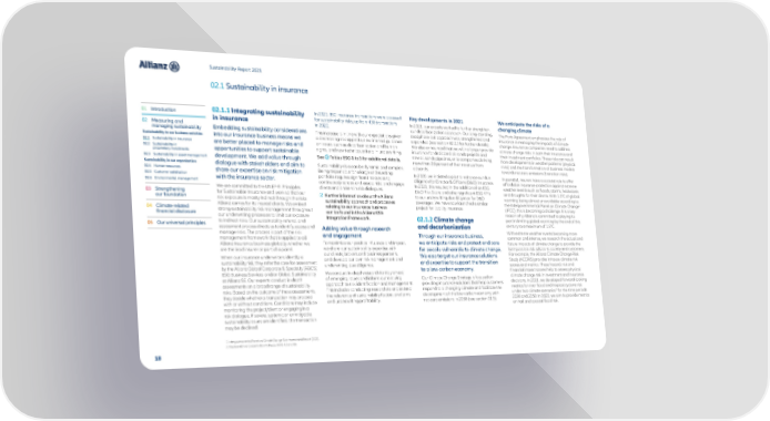 Sustainability Report 2021 02.1 Sustainability in insurance 01 Introduction 02.1.1 Integrating sustainability In 2021, 850 insurance transactions were assessed Key developments in 2021 We anticipate the risks of a in insurance for sustainability risks, up from 430 transactions In 2021, our experts worked to further strengthen changing climate 02 Measuring and in 2020. our decarbonization approach. Our long-standing The Paris Agreement emphasizes the role of managing sustainability Embedding sustainability considerations This increase is in line with our expectations given coal phase-out approach was strengthened and insurance in managing the impacts of climate Sustainability in our business activities into our insurance business means we a decreasing risk appetite, new internal guidance expanded (see section 02.2.3 for further details). change. Insurance companies need to address 02.1 Sustainability in insurance are better placed to manage risks and on issues such as decarbonization and human We also announced that we will no longer provide climate change risks in both their insurance and 02.2 Sustainability in opportunities to support sustainable rights, and new technical criteria in underwriting. insurance for dedicated oil sands projects and their investment portfolios. These risks can result proprietary investments See Tables ESG-1 to 3 for additional details. new oil sands pipelines, or to companies deriving from developments in weather patterns (physical 02.3 Sustainability in asset management development. We add value through more than 20 percent of their revenue from risks) and the transformation of business models Sustainability in our organization dialogue with stakeholders and aim to Sustainability risks can be dynamic and complex. oil sands. towards net-zero emissions (transition risks). 02.4 Human resources share our expertise on risk mitigation Being responsible for a large underwriting In 2020, we initiated a pilot to enhance our due 02.5 Customer satisfaction portfolio requires significant resources to In parallel, insurers have a societal role to offer 02.6 Environmental management with the insurance sector. continuously screen and assess risks and engage diligence for Director & Officers (D&O) insurance. affordable insurance protection against extreme We are committed to the UNEP-FI Principles clients and brokers in risk dialogues. In 2021, this resulted in the addition of an ESG weather events such as floods, storms, heatwaves 03 Strengthening for Sustainable Insurance and work so that our D&O Risk Score and other significant ESG KPIs and droughts for their clients. With 1.5°C of global our foundation risk exposure is mostly indirect through the risks Further information about the Allianz to our underwriting due diligence for D&O warming being almost unavoidable according to sustainability approach and processes coverages. We have now launched a similar 1 Allianz carries for its insured clients. We embed relating to our insurance business the Intergovernmental Panel on Climate Change 04 Climate-related strong sustainability risk management throughout project for liability insurance. (IPCC), this is becoming a challenge. It is a key financial disclosure our underwriting processes to limit our exposure can be found in the Allianz ESG reason why Allianz is committed to playing its to indirect risks. Our sustainability referral and Integration Framework. 02.1.2 Climate change part in limiting global warming by the end of this 05 Our universal principles assessment process directs us to identify, assess and Adding value through research and decarbonization century to a maximum of 1.5°C. manage risks. The process is part of the risk and engagement Through our insurance business, With extreme weather events becoming more management framework that is applied to all common and intense, we research the actual and Allianz insurance business globally, whether we To maximize our positive influence and impact, we anticipate risks and protect and care future impacts of climate change to provide the are the lead insurer or part of a panel. we share our sustainability expertise with for people vulnerable to climate change. best possible risk advice to society and customers. When our insurance underwriters identify a our clients, brokers and business partners, We also target our insurance solutions For example, the Allianz Climate Change Risk sustainability risk, they refer the case for assessment and develop our own risk management and and expertise to support the transition Study (ACCRiS) provides inhouse climate risk by the Allianz Global Corporate & Specialty (AGCS) underwriting due diligence. to a low-carbon economy. scores and metrics. These hazard, risk and ESG Business Services and/or Global Sustainability We conduct in-depth research to stay ahead financial impact scores help to assess physical at Allianz SE. Our experts conduct in-depth of emerging issues and inform our evolving Our Climate Change Strategy is focused on climate change risk in investment and insurance assessments on a broad range of sustainability approach to risk identification and management. providing insurance solutions that help customers decisions. In 2021, we developed forward-looking risks. Based on the outcome of these assessments, This includes conducting research to understand respond to a changing climate and facilitate the metrics for river flood and tropical cyclone risk 2 for the time periods they decide whether a transaction may proceed the relevance of sustainability factors on claims development of the low-carbon economy with under two climate scenarios with or without conditions. Conditions may include and underwriting profitability. net-zero emissions in 2050 (see section 01.5). 2030 and 2050. In 2022, we aim to provide metrics monitoring the project/client or engaging in a on hail and coastal flood risk. risk dialogue. If severe, systemic or unmitigable sustainability issues are identifie