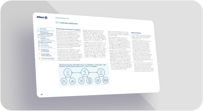 Sustainability Report 2021 02.5 Customer satisfaction 01 Introduction Transforming our business for customers Within this context, ACM was designed first for We have created 15 master products, which will Sales compliance We’ve listened to our customers and we know that Retail Property and Casualty lines and then reduce the number of products in most relevant Since 2011, Allianz has a global Sales Compliance 02 Measuring and they want us to sell simple products, use easy- extended to Health, Life, B2B2C, MidCorp, operating entities from more than 1200 in 2019 to Program in place, which describes standardized managing sustainability to-understand insurance language and provide Large Corporate and Reinsurance. It has been around 250 by 2024. processes and controls for communication, Sustainability in our business activities faster claims handling. They also want to be able continuously rolling out across Allianz operating We are scaling ACM via the Business Master monitoring, and review. 02.1 Sustainability in insurance to access their insurance details whenever and entities and, by end of 2021, was presented in more Platform (BMP). The BMP is a new global IT 02.2 Sustainability in however they choose. We have adapted our than 30 countries covering 95 percent of property solution for Allianz that digitalizes the business The program is managed by Group Compliance. proprietary investments business in response by simplifying and digitalizing and casualty retail gross written premium. requirements of ACM by integrating them with the In 2020, the Sales Compliance Framework 02.3 Sustainability in asset management our products, processes and platforms. As a result, A tangible example of how ACM is transforming IT Master Platform. It comprises a combination of was revised to reflect recent developments Sustainability in our organization our customers have a better understanding of our business is the new structure of our products. the scalable technological elements, systems and in regulatory standards and to condense its 02.4 Human resources what they are buying and greater access to advice We now focus on offering simple and intuitive services plus functionalities and configurations existing sales compliance requirements into 02.5 Customer satisfaction and support, while more efficient processes are products with a maximum of three variations defined by the ACM to better serve our customers, a new corporate rule, the Allianz Standard 02.6 Environmental management improving our customer service. and limited number of add-ons per product offer. intermediaries, partners and employees. for Sales Compliance. This Standard is now The Allianz Customer Model (ACM) is our end- Launched in Allianz Germany in January 2020, BMP also scales the ACM philosophy with one look the organization’s consolidated framework 03 Strengthening to-end global business model which puts the Privatschutz 2.0 was the first fully ACM-compliant and feel and one outstanding user experience for customer protection. It outlines rules and our foundation customer at the center of our business and product. After its introduction, Privatschutz 2.0 that gives our customer, agents and partners principles for compliant and ethical sales enables Allianz to be simple, digital and scalable. has generated 2–3 times more new business anywhere in the world the same experience and practices across the Allianz Group and specifies 04 Climate-related Simplifying and harmonizing our business globally compared to the previous product. It forms the satisfaction when easily interacting with Allianz. key principles to ensure appropriate fairness financial disclosure foundation for our global non-motor product. and transparency to customers, including in means transforming the whole value chain across For example, the claims tracker in BMP provides respect of the remuneration of distributors, 05 Our universal principles products, sales, claims and operations. This is full transparency to our customers throughout the and to address the sales compliance risks arising already providing real customer satisfaction. claims process. Customers can easily access the in its business segments. portal and navigate with just a few clicks to choose These responsible sales controls reflect Allianz’s the preferred settlement option and repair shop clear commitment to fairness and transparency Simplicity as a key driver when transforming our core and developing new models at scale. and receive confirmation of the repair appointment as formulated in Allianz’s Code of Conduct. The Allianz ACM facilitates the transformation in three main dimensions: with a rescheduling option. The BMP will be rolled This Code emphasizes that being fair and out for at least one retail line of business in five transparent with its customers about its products operating entities by the end of 2022. and services, including their limitations is the best guarantee to enjoy customers’ long-term trust. Simple Digital Scalable Trouble Fewer No Enhanced free Cost and Harmonized intuitive negative data processes revenue products and products surprises analytics without synergies processes legacy 50