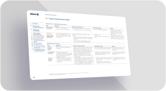 Sustainability Report 2021 05.1 Target and achievement tables 01 Introduction Sustainability in our business activities continued Topic Targets 2021 Progress and Achievements 2021 Targets 2022 and beyond Reference 02 Measuring and Balanced gender • 40 % women in Allianz talent pool. • 43.4% (2020: 42.3 %) women in Allianz talent pool. • 50 % women in Allianz talent pool by 2024. For further insights into our gender managing sustainability representation representation, please refer to section 02.4 • 30 % women in senior executive positions. • 24.7 % (2020: 25.8 %) women in senior executive positions. 03 Str engthening and table HR-6. Also refer to our Non- our foundation Financial Statement, section Employee matters, p. 69–70. 04 Climate-r elated Board target • For over 75 % of Allianz Group business We achieved the highest ever measured NPS results • Digital NPS tracking. For further insights into our global customer financial disclosure Global customer segments to outperform their local market for Allianz: • Our Group ambition is to reach 50 % loyalty leaders satisfaction, please refer to section 02.5 and satisfaction (NPS (meaning either above market or Loyalty • 48 out of 57 measured segments have been either above by 20241. table CS-1. Also refer to our Non-Financial 05 Our universal principles performance) Leader position). local market or Loyalty Leaders resulting in a share of 84 % Statement, section Social matters, p. 64–67. 05.1 Target and achievement tables (2020: 79 %). 05.2 How we report: transparent • 33 out of 57 measured segments have been Loyalty reporting, ratings and performance Leaders resulting in a share of 58 % (2020: 60 %). 05.3 Materiality 05.4 Stakeholder engagement Strengthening our foundation 05.5 Sustainability governance 05.6 Our commitment to human rights Topic Targets 2021 Progress and Achievements 2021 Targets 2022 and beyond Reference 05.7 Our impact on the U.N. Sustainable Corporate Continue with the implementation of the In 2021, we continued to evolve our Corporate Citizenship Continue with the implementation of the new strategy For further insights into our Corporate Development Goals citizenship new strategy. Strategy and approach. We published our Guidance on and roll out of the impact measurement framework. Citizenship Strategy, please refer to sections 05.8 Independent practitioner’s report strategy Corporate Citizenship Activities and Guidance on Social 01.4 and 03.1. on a limited assurance engagement Impact Measurement for Corporate Citizenship Activities. on sustainability information Long-term global Increase the resilience and equal In 2021, our partnership with SOS CVI with a focus Continued review of our global partnership and For further insights into our long-term global partnerships opportunities of children and young people on Emergency Preparedness & Response and Youth development of a partnership framework for local partnerships , please refer to sections in 2021 by focusing specifically on Emergency Employability programs (e.g. YouthCan!) continued. Corporate Citizenship activities. 01.4 and 03.1. Preparedness & Response and Youth As planned, the partnership came to an end after six years Employability programs. at the end of 2021. Corporate Continue to contribute to communities and In 2021, the Allianz Group contributed through Corporate • Continue to contribute to society through corporate For further insights into our corporate citizenship societies through corporate giving and Giving and employee volunteering as well as activities giving and employee volunteering in alignment citizenship activities, please refer to sections activities employee volunteering in alignment with through its twelve corporate foundations. We had corporate with our strategy. 01.4 and 03.1. our strategy. citizenship activities benefiting communities worldwide. • Identify and launch activities that would be We launched the Allianz Social Impact Fund to foster OEs supported through the Allianz Social Impact Fund. to carry out local activities in line with our strategy. 1 Digital NPS tracking allows us to measure customer loyalty continuously and against a broader set of competitors. This new measurement will set higher standards therefore we have adjusted our digital NPS targets accordingly. 96