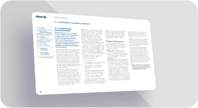 Sustainability Report 2021 02.2 Sustainability in proprietary investments 01 Introduction 02.2.3 Climate change Allianz has set an intermediary target to reduce performance and how to set appropriate targets. gas downstream. Most of oil and gas companies and decarbonization GHG emissions by 25 percent by year-end 2024 Allianz is working with the U.N.-convened Net- have not yet set Scope 3 targets making it 02 Measuring and compared to a 2019 baseline for its equity and Zero AOA to finalize the methods for sovereign difficult to track progress. We are reviewing our managing sustainability The financial sector has a crucial role tradeable corporate bonds portfolio. In addition bonds as next asset class. We will set targets approach to engaging companies around Scope Sustainability in our business activities to play in enabling a low-carbon future. to traditional investment criteria, we assess for this asset class within 12 months after the 3 emissions. 02.1 Sustainability in insurance As asset owners, we are uniquely whether equities and corporate bonds are in recommended methodology is released by We also aim to increase our bilateral engagement 02.2 Sustainability in line with a 1.5°C pathway. In 2021, Allianz has the AOA. activities by at least 100 percent by end of 2024. proprietary investments positioned to help shape the global reached the -25 percent decarbonization target Engagement at the industry level In addition we will increase our participations in 02.3 Sustainability in asset management economy and financial systems. of its equity and corporate bonds portfolio. collaborative engagements such as CA100+ and Sustainability in our organization This includes driving the decarbonization Target achievement was supported by estimated To support the shift towards a low-carbon will drive sector and asset manager engagements 02.4 Human resources of investment portfolios and supporting four to five percent from COVID-19 shutdowns economy, we are also active at the industry sector activities as part of the AOA. 02.5 Customer satisfaction and estimated three percent from positive market level. Our interim targets for year-end 2024 02.6 Environmental management greenhouse gas (GHG) emission reductions developments. The normalized emission reduction focus on two of the highest emitting-industries: In 2021, Allianz released an update of its policy in the real economy. in 2021 is estimated at 16 percent and driven by Utilities, and Oil and Gas: on coal-based business models which defined 03 Strengthening active portfolio measures and emission reduction Utilities: Complementing our coal phase- in particular even more ambitious thresholds our foundation We strategically consider climate criteria in all our of investee companies. We also target that our from 2023 and a clear pathway to further reduce business lines. Our long-term commitment is to direct real estate portfolio will be aligned with out commitment by gradually increasing our thresholds in the future. In order to smooth the 04 Climate-related achieve net-zero GHG emissions in our proprietary science-based 1.5°C pathways by year-end 2024. investments in renewables and following at least transition to these stricter pathways, issuers which financial disclosure investment portfolio by 2050, in line with the the necessary annual growth rate of 5.85 percent are expected to potentially breach the new Target-Setting Protocol of the U.N.-convened Furthermore, in 2021 we have introduced as proposed by the International Renewable thresholds from 2023 were put on Freeze, which 05 Our universal principles Net-Zero Asset Owner Alliance (AOA). This means new targets for our equity and debt Energy Agency (IRENA). means, no exposure increase is allowed. This Freeze that, as asset owners, we will assist, incentivize infrastructure investments. Oil and Gas: Supporting the commitment set out affected € 0.2 billion public equity and € 3.4 billion and require our portfolio companies to embark These targets foresee: by the industry-led Oil and Gas Climate Initiative fixed-income exposure. Given this extensive Freeze, on decarbonization pathways consistent with the • Full transparency on financed emissions latest (OGCI) to limit the emissions intensity for Scope 1 there are no additional divestments reported 1.5°C objective of the Paris Agreement. As our by year-end 2023 for all investments. and 2 emissions of companies in their exploration for 2021. portfolio companies progress towards low-carbon and production business (‘upstream’) to less than For more information on our portfolio carbon business models, we will automatically see our • For direct equity investments an absolute 20 kg CO e per barrel of oil and aligning our Oil portfolio decarbonize. carbon reduction of 28 percent by year- 2 footprint, see our Climate-related financial end 2025. and Gas exposure on average listed equity and disclosure (section 04) and section 3.9.2 of the We use leading academic climate scenarios corporate bonds portfolio to this intensity level. Allianz ESG Integration Framework. like the ones used for the reports by the • New direct (equity and debt) investments Engaging with companies to set net-zero targets Intergovernmental Panel on Climate Change in high emitting assets only in case a 1.5°C on Scope 1 and 2 emissions by 2050. By 2025, (IPCC) to determine alignment with our goal. aligned decarbonization plan is in place. we aim for at least 50 percent of our assets under Targets are based on scenarios which foresee swift • Phase in of net-zero targets for new fund management in the oil and gas sector to have set emission reductions and project that the 1.5°C investments until year-end 2024. these targets. Similar to our own Scope 3 targets, goal is not, or is only slightly, overshot. They do the oil and gas industry also has a responsibility to not backload emissions reductions by assuming These portfolios make up around 36 percent reduce their S