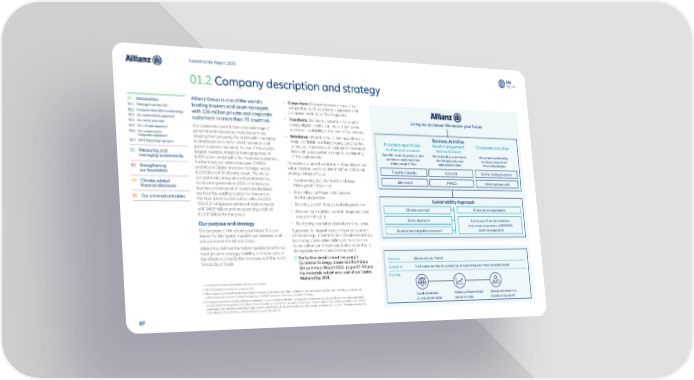 Sustainability Report 2021 GRI 102-14 01.2 Company description and strategy 01 Introduction Allianz Group is one of the world’s • Outperform: We seek to move ahead of our leading insurers and asset managers competitors, both traditional businesses and 01.1 Message from the CEO disruptors, to drive profitable growth. 01.2 Company description and strategy with 126 million private and corporate Living our purpose: We secure your future 01.3 Our sustainability approach customers1 in more than 70 countries. • Transform: We seek to become simpler and 01.4 Our social approach deeply digital, and to put – in addition to the 01.5 Our climate approach Our customers benefit from a broad range of customer – scalability at the heart of our actions. 01.6 Our sustainability personal and corporate insurance services, • Rebalance: We seek to build leading positions in Business Activities integration approach ranging from property, life, and health insurance large, profitable, and fast-growing geographies Insurance operations Asset management Corporate and other 01.7 2021 Reporting highlights to assistance services to credit insurance and as well as in new areas of business. An increased Confidence in tomorrow Real world impact global business insurance. As one of the world’s focus will be placed on an organic rebalancing We offer insurance products that We responsibly invest assets We embed sustainability 02 Measuring and largest investors, Allianz is managing around of the business mix. protect our customers from that mitigate risks and to deliver value for all managing sustainability € 849 billion on behalf of its insurance customers. a wide range of risks. seize opportunities. of our stakeholders. Furthermore, our asset managers PIMCO To realize our growth ambition and accelerate our 03 Strengthening and Allianz Global Investors manage nearly value creation, we have identified five additional Property-Casualty Allianz GI Central holding functions our foundation € 2.0 trillion of third-party assets. Thanks to strategic areas of focus: 04 Climate-related our systematic integration of environmental, • Transforming the Life/Health and Asset Life/Health PIMCO Other business units financial disclosure social and governance (ESG) criteria in our Management franchise business processes and investment decisions, • Expanding our Property & Casualty 05 Our universal principles we hold the leading position for insurers in leadership position the Dow Jones Sustainability Index. In 2021, Sustainability Approach 2 employees achieved total revenues • Boosting growth through scalable platforms 155,411 3 Allianz as an organization of € 148.5 billion and an operating profit of • Deepening the global vertical integration and Climate approach 4 € 13.4 billion for the group. execution of agility Our purpose and strategy • Reinforcing capital productivity and resilience Social approach Allianz as a financial institution (insurance, proprietary investments, Our purpose is ‘We secure your future’. It is our Sustainability integration is an important element Governance integration approach asset management) reason for being and it guides our decisions and of the strategy implementation. We aim at carefully actions across the Allianz Group. balancing across stakeholders, at the same time Allianz has defined the following objectives for our as we deliver benchmark results at scale and build medium-term strategy, building on the success of strong resilience in a transforming world. the efforts to simplify the company, with the motto For further details about the group’s Purpose We secure your future ‘Simplicity at Scale’: Corporate Strategy, please see the Allianz Group Annual Report 2021, pages 97–98 and Aspiration The trusted partner for protecting and growing your most valuable assets the materials published as part of our Capital Markets Day 2021. Promise 1 Including non-consolidated entities with Allianz customers. 2 Total employees (core and non-core business). 3 Total revenues comprise Property-Casualty total revenues (gross premiums written, and fee and commission income), Life/Health statutory gross premiums written, operating revenues in Asset Management, and total revenues in Corporate and Other (Banking). Careful balance Delivery of benchmark Strong resilience in a 4 Earnings from ordinary activities before income taxes and non-controlling interests in earnings, excluding (if and as applicable for each business segment) all or some of the following items: income from financial assets and liabilities carried at fair value through income (net), realized gains/losses (net), impairments of across stakeholder results at scale transforming world investments (net), interest expenses from external debt, amortization of intangible assets, acquisition-related expenses, restructuring and integration expenses, and profit/loss of substantial subsidiaries held for sale, but not yet sold. 07