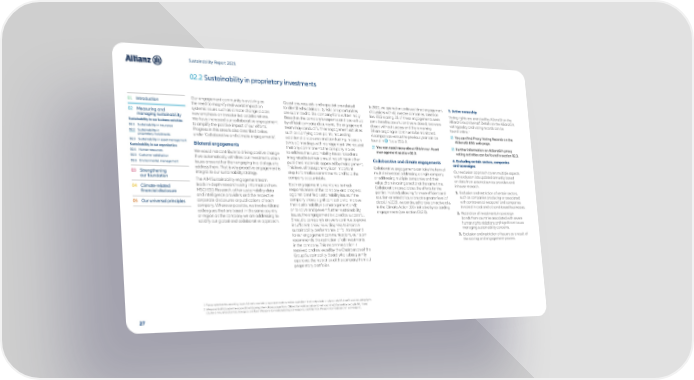 Sustainability Report 2021 02.2 Sustainability in proprietary investments 01 Introduction Our engagement community is evolving as Questions, requests and expectations related In 2021, we opened or continued direct engagement 5. Active ownership the need to magnify real-world impact on to identified sustainability risks or opportunities discussions with 61 investee companies, based on Voting rights are exercised by AllianzGI on the 02 Measuring and systemic issues such as climate change places are submitted to the company for a written reply. low ESG scoring. 21 of these engagements were Allianz Group’s behalf. Details on the AllianzGI’s managing sustainability new emphasis on investor-led collaborations. Based on the company’s response and backed-up considered successful and were closed, two were voting policy and voting records can be We have increased our collaborative engagement by official company documents, the engagement closed without success and the remaining 1 Sustainability in our business activities to amplify the positive impact of our efforts. team may conduct further engagement activities 38 are ongoing or continue to be monitored. found online. 02.1 Sustainability in insurance Progress in this area is also described below such as clarifying open points, requesting A comparison versus the previous year can be You can find Proxy Voting Records on the 02.2 Sustainability in under ‘Collaborative and climate engagements’. additional disclosures and conducting in-person found in Table ESG-9. AllianzGI ESG web page. proprietary investments 02.3 Sustainability in asset management Bilateral engagements (virtual) meetings with management. We request You can read more about this in our Asset Further information on AllianzGI’s proxy Sustainability in our organization that any commitments the company makes management section 02.3. voting activities can be found in section 02.3. 02.4 Human resources We would not contribute to driving positive change to address the sustainability issues raised are 02.5 Customer satisfaction if we automatically withdrew our investments when integrated into their annual reporting or other Collaborative and climate engagements 6. Excluding certain sectors, companies 02.6 Environmental management issues arose rather than engaging in a dialogue to published materials approved by management. and sovereigns address them. That is why proactive engagement is This level of transparency is an important Collaborative engagements can take the form of Our exclusion approach covers multiple aspects 03 Strengthening integral to our sustainability strategy. step to formalize commitments and hold the multiple investors addressing a single company with exclusion lists updated annually based our foundation company accountable. or addressing multiple companies and their on data from external service providers and The AIM Sustainability engagement team Each engagement is monitored to track value chain in a single sector at the same time. inhouse research. 04 Climate-related leads in-depth research using information from responsiveness of the company and progress Collaboration consolidates the efforts for the financial disclosure MSCI ESG Research, other sustainability data parties involved, allowing for more efficient and 1. Exclusion and restriction of certain sectors, and intelligence providers and the respective against identified sustainability issues. If the solution-oriented discussions at a greater level of such as companies producing or associated company shows significant action to improve 2 05 Our universal principles corporate disclosures or publications of each detail. In 2021, we continued to take an active role with controversial weapons and companies company. Wherever possible, we involve Allianz their sustainability risk management and/ in the Climate Action 100+ initiative by co-leading involved in coal and oil sand-based businesses. colleagues that are based in the same country or to solve and prevent further sustainability engagements (see section 02.2.3). 2. Restriction of investments in sovereign or region as the company we are addressing to issues, the engagement is closed as successful. bonds from countries associated with severe solidify our global and collaborative approach. Should a company’s answers continue to prove human rights violations and significant issues insufficient, show no willingness to improve managing sustainability concerns. sustainability performance, or fail to respond to our engagement communications, our team 3. Exclusion and restriction of issuers as a result of recommends the restriction of all investments the scoring and engagement process. in the company. This recommendation is received and reviewed by the Chairperson of the Group Sustainability Board who subsequently approves the restriction of the company from all proprietary portfolios. 1 Please note that this reporting covers Allianz’s proprietary insurance assets as well as assets from third-party clients on whose behalf AllianzGI exercises voting rights. 2 Weapons that fall under the scope of the following international conventions: Ottawa Convention (anti-personnel landmines); Convention on Cluster Munitions (cluster ammunition/bombs); Biological and Toxin Weapons Convention (biological weapons); and Chemical Weapons Convention (chemical weapons). 27