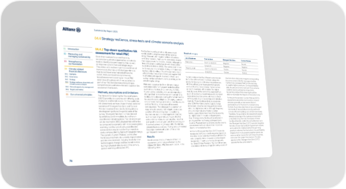 Sustainability Report 2021 04.4 Strategy resilience, stress-tests and climate scenario analysis 01 Introduction 04.4.2 Top-down qualitative risk For the first round qualitative risk assessment, Result of analysis assessment for retail P&C we decided to keep the scope of the exercise 02 Measuring and straightforward with regards to lines of business Line of business Time horizon Divergent Net-Zero Current Policies managing sustainability Given their business focus and flexibility, and time horizons. Participants were asked to give Motor retail Short- to mid-term Negative Neutral we consider qualitative approaches as suitable their assessments for the retail motor and property 03 Strengthening tools to identify risks and opportunities as well lines of business and for two time horizons (2022 Long-term Negative Negative our foundation as response options from a strategic angle. to 2030 and 2031 to 2050). The survey was limited Property retail Short- to mid-term Positive Neutral They allow us to explore in principle a rich set of to Europe, our main market. Giving participants a Long-term Positive Positive 04 Climate-related transmission channels and interdependencies better understanding of how the scenarios might financial disclosure that do not have to be hardwired from the affect the business environment, we augmented 04.1 Highlights outset. Here, we report on a pilot survey- NGFS data with specific business drivers such Transition risks under the different scenarios can the transitions risks) which require corresponding 04.2 Governance based assessment covering our major P&C as the numbers of electric vehicles or targets for be further differentiated into three categories: insurance cover and offer new opportunities. 04.3 Strategy retail lines of business which we launched as retrofitting buildings. policy, technological and consumer preferences. Furthermore, increased NatCat risks are likely 04.4 Strategy resilience, stress-tests and part of our first iteration towards building a Risks and opportunities from climate change All three will weigh on future premium growth to lead to higher premiums. On the profitability climate scenario analysis comprehensive qualitative risks and opportunities were assessed on a four-point scale based on and profitability in retail motor. Higher carbon side, the picture is more nuanced. More extreme 04.5 Risk and opportunity management assessment framework. qualitative criteria such as shrinking markets, prices, for example, will translate into higher weather events will lead to rising claims, 04.6 Targets and metrics higher claims, dwindling reinsurance capacity or mobility costs. At the same time, expected high but pricing and portfolio steering should be Methods, assumptions and limitations changes that increase the market’s susceptibility public investments should make public transport able to neutralize the impact on the bottom line. 05 Our universal principles The Network for Greening the Financial System to disruption, also considering efforts that need to more attractive. Consumers will react to these Turning to the scenario ‘Current Policies (3.0˚C)’, (NGFS) provides six scenarios with differing levels be undertaken to adapt to a changing business shifts by reducing car ownership and individual assessments are similar, but transition impacts of physical and transition risks. For the qualitative environment. Ratings were established for volume mobility. These trends are likely to accelerate are seen generally as less severe; this is in risk assessment, we have chosen the two ‘extreme’ and profitability impacts as well as overall after 2030. For Allianz, technological change particular true for the short- to mid-term time scenarios of ‘Divergent Net-Zero’ and ‘Current consequences. The subsequent assessment of is the main driver for declining profits in motor horizon. As policies stay more or less unchanged, Policies’ to present two clearly distinguishable requirements towards risk mitigation considers retail, i.e., higher loss ratios. Although frequency the trends of less individual mobility and more development paths to the participants of the whether effective mitigation is provided by of claims might decline thanks to better climate efficient buildings will unfold more slowly. survey. ‘Divergent Net-Zero’ is characterized business-as-usual risk management practices, technologies, this is more than offset by severity, Therefore, the qualitative risk assessment expects by ambitious and immediate, but rather un- such as re-pricing or reinsurance, or whether i.e., higher costs for repairs and spare parts. almost no change in the business environment coordinated climate policies. The net-zero target extraordinary measures such as a business-line Over the long-term, this should be reflected in until 2030. Only after this the impact of these will be reached in 2050; physical risks will be low exit need to be taken, and whether a strategy on pricing and then technological impact turns trends will be felt, and in the same direction as in as compared to scenarios with more severe global how the business might respond to the risk has neutral. Physical risks like extreme weather events the ‘Divergent Net-Zero (1.5˚C)’ scenario (negative warming, but the lack of policy coordination already been elaborated. Ratings are commented are assessed to have only a minor impact on for retail motor due to declining premium volume across sectors results in rather high transition for proper contextualization of the survey claims in the motor business. and positive for retail property through rising costs, compounded by fast technological change. participants’ choices. While the ‘Divergent Net-Zero (1.5˚C)’ scenario premium volume). For the bottom line, profitability The scenario ‘Current Policies’, on the other is expected to have a clearly negative impact on impacts from more extreme weather events are hand, assumes that only curr