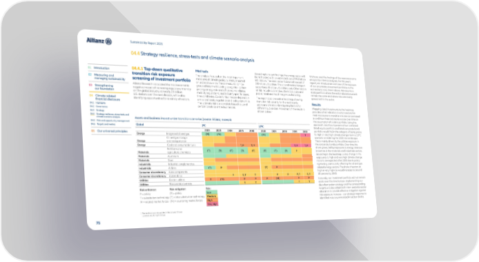 Sustainability Report 2021 04.4 Strategy resilience, stress-tests and climate scenario analysis 01 Introduction 04.4.1 Top-down qualitative Methods According to report findings, the energy sector will We have used the findings of this macroeconomic transition risk exposure The analysis focused on the most important be hit hardest with an estimated cost of 900 billion analysis for internal analyses. For this year’s 02 Measuring and measures of climate policy currently enacted U.S. dollars. The steel sector follows with a cost of report, we introduce an overview of the exposure managing sustainability screening of investment portfolio or under discussion. These measures can be 300 billion U.S. dollars. The air and marine transport of our proprietary investment portfolios to the Allianz Research calculated the macroeconomic grouped into the following categories: carbon sector faces 55 billion U.S. dollars costs. Other sectors sub-sectoral risks shown above. We assume a 03 Strengthening negative impact of increasing regulatory intensity pricing; energy mix and efficiency mandates; at risk include automotive, chemicals, pulp and static portfolio where the sector allocation would our foundation on the global industry at nearly 2.5 trillion mobility regulations; and industry-specific taxes, paper, retail and machinery/manufacturing. remain the same and where risks are evenly U.S. dollars over the next decade, while also fines and levies. Costs for businesses depend on The report also presents a heat map showing spread within the sector. 04 Climate-related identifying opportunities for a variety of sectors. emissions’ costs, regulation and policy dynamics. transition risk severity for the next twenty Results financial disclosure The ultimate risk is a complete loss of value of years and drivers and mitigating factors for 04.1 Highlights certain assets or entire businesses. different sub-sectors. An extract of the results is Mapping listed investments to the heatmap 04.2 Governance shown below.1 provides a first indication in which sectors the 04.3 Strategy main exposures to transition risk are concentrated 04.4 Strategy resilience, stress-tests and in and how these exposures evolve over time on climate scenario analysis Assets and business impact under transition scenarios (source: Allianz, excerpt) the assumption of a static portfolio. Using this 04.5 Risk and opportunity management approach, less than 4 percent of our combined 04.6 Targets and metrics Global 2ºC 1.5ºC listed equity portfolio and listed corporate bond 05 Our universal principles 2020 2025 2030 2035 2040 2020 2025 2030 2035 2040 portfolio would fall in the category of being prone Energy Integrated oil and gas (M) (M) (M) T to high or very high climate change risk in a 1.5°C Oil and gas storage scenario considering the 2020 risk landscape. Energy and transportation This is mainly driven by the utilities exposure in Energy Coal and consumable fuels T, P T, P T, P T, P the corporate bonds portfolio. Over time this Fertilizers and share grows, led by exposures to energy intensive Materials agricultural chemicals (T) (T) (T) (T) (T) (T) (T) (T) P industries in the materials and industrials sectors. Materials Aluminum According to the heatmap, a step change in the Materials Steel exposures to high and very high climate change risk is to be expected after 2030 due to policy Industrials Industrial conglomerates tightening, particularly affecting the oil and gas Industrials Airlines (T) P (T) P related energy sectors. The share of sectors at Consumer discretionary Auto components high or very high risk would increase to around Consumer discretionary Automobiles P P, T T P P P, T P, T 18 percent by 2040. Utilities Electric utilities P (M) P P P (M) P P Naturally, our investment portfolio will not remain Utilities Renewable electricity T T T T static over this time horizon. Implementing our Risk enhancer: Risk mitigator: Risk: decarbonization strategy and the corresponding P = policy (P) = policy Low targets will also adapt both inter- and intra-sector T = substitution technology (T) = little substitution technology Medium allocation to provide effective mitigation against M = related market forces (M) = countering market forces High this exposure increase – our strategic response to identified risks is summarized in section 04.4.6. Very high 1 The heatmap was not updated in the last year. If it was updated, results might change. 75