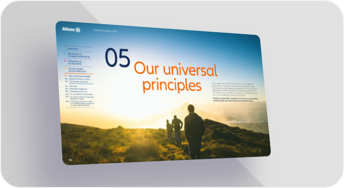 Sustainability Report 2021 01 Introduction 02 Measuring and managing sustainability 03 Strengthening our foundation 05 04 Climate-related Our universal financial disclosure 05 Our universal principles 05.1 Target and achievement tables In this chapter, we provide an overview of the key foundational 05.2 How we report: transparent principles of our approach to reporting and sustainability ratings. reporting, ratings and performance We discuss how topics that are most material to our business and our 05.3 Materiality principles stakeholders are identified and how we embed sustainability in our 05.4 Stakeholder engagement governance. We also provide an overview of our intended impact on 05.5 Sustainability governance the U.N. Sustainable Development Goals (SDGs). 05.6 Our commitment to human rights 05.7 Our impact on the U.N. Sustainable Finally, we close with a detailed overview of our sustainability- Development Goals related targets and achievements across Allianz Group. 05.8 Independent practitioner’s report on a limited assurance engagement on sustainability information 93