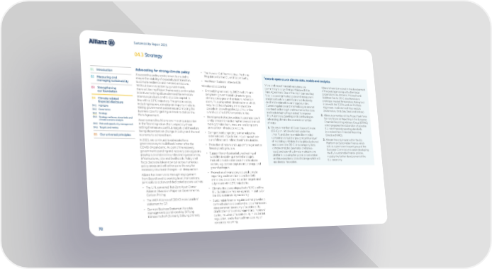 Sustainability Report 2021 04.3 Strategy 01 Introduction Advocating for strong climate policy • The Investor Call for Ambitious Methane Towards open source climate data, models and analytics A supportive policy environment is crucial to Regulation for the Oil and Gas Industry; 02 Measuring and ensure the viability of a socially-just transition • We Mean Business letter to G20. More and more financial institutions are Allianz is heavily involved in the development managing sustainability to climate resilience and net-zero emissions. We also advocate for: committing to align their portfolios with the of the prototype along with other large Without decisive action by governments, • Embedding ‘net-zero by 2050’ in short- and Paris Agreement. One of the main barriers they corporations like Amazon, Microsoft and 03 Strengthening there will be insufficient frameworks and market face is accessing trusted data and transparent Goldman Sachs. OS-C also develops a our foundation incentives to bring down demand for emission- long-term governmental climate targets, analytical tools to quantify and act decisively prototype Implied Temperature Rating tool intensive products and to allocate capital in climate strategies and emissions reduction on climate-related risk and opportunities. in line with the TCFD’s work on Portfolio 04 Climate-related line with a 1.5°C trajectory. The private sector, plans, following latest climate science which Current regulation and methodologies are not Alignment. It will start with four sectors financial disclosure including insurers, can play an important role in requires at least halving emissions every standardized enough and the market for data (Automotive, Oil & Gas, Steel and Utilities). 04.1 Highlights raising government awareness and making the decade in line with pathways of no or low and tools is highly fragmented. To improve 04.2 Governance business case for getting on track to deliver the overshoot of a 1.5°C temperature rise. this, Allianz is supporting and contributing to 2. Allianz is a member of the Project Task Force 04.3 Strategy Paris Agreement. • Development of sector policies to promote a swift advancing climate disclosures in a number for non-Financial Reporting in the European 04.4 Strategy resilience, stress-tests and Asset owners like Allianz are in a unique position and just transition including the development of of ways: Financial Reporting Advisory Group (EFRAG) climate scenario analysis more granular short-, medium- and long-term which prepares the elaboration of possible 04.5 Risk and opportunity management in the financing value chain, especially those zero carbon infrastructure plans. 1. We are a member of Open Source Climate E.U. non-financial reporting standards 04.6 Targets and metrics setting themselves portfolio targets and therefore (OS-C), an initiative hosted under the in a revised Non-Financial Reporting being dependent on change in policy and the real • Stringent carbon pricing to internalize the Linux Foundation to enable like-minded Directive (NFRD). 05 Our universal principles economy to achieve them. external costs of pollution, including a phase- companies to build a ‘pre-competitive layer’ 3. We are the only insurer within the E.U. In 2021, we continued to advocate for a out of direct and indirect fossil fuel subsidies. of modeling and data that is globally shared Platform on Sustainable Finance which green recovery to build back better after the • Protection of nature and support for regenerative and accessible. OS-C links company data, acts as a permanent expert group of the COVID-19 pandemic. As part of the recovery, forestry and agriculture. climate analytics (scenarios and stress- European Commission to assist developing government spending and recovery packages are • Support for and potentially redirecting of tests) and scientific climate models in one the E.U.’s sustainable finance policies, playing a pivotal role in underpinning economies, subsidies to scale-up new technologies platform, allowing for global collaboration notably the further development of the infrastructures, jobs and livelihoods. Policy and that will provide solutions in hard to abate on this exceptional data challenge which will E.U. taxonomy. fiscal decisions taken now cut across numerous sectors, e.g. carbon capture and storage and accelerate innovation. policy areas and will either pave the way for green hydrogen. necessary structural changes – or delay action. Allianz has been vocal through engagement • Promotion of mandatory assured climate from Board-level to working-level interventions, reporting and transition plans like GHG joint calls to action and dedicated papers such as: emissions, associated reduction targets and alignment with 1.5°C trajectories. • The U.N. convened Net-Zero Asset Owner • Climate disclosure aligned with TCFD and the Alliance Discussion Paper on Governmental E.U. Sustainable Finance agenda, in particular Carbon Pricing; the E.U. sustainability taxonomy. • The WEF Alliance of CEO Climate Leaders’ • Sustainable finance regulation that provides a statement to G7; defined, science-based and reliable framework • German Business Statement for crisis via a common taxonomy of sustainability, management coordinated by Stiftung clarification of asset managers’ and investors’ Klimawirtschaft (formerly Stiftung 2 Grad); duties, inclusion of sustainability in prudential regulation, and enhanced transparency of 72 corporate reporting.