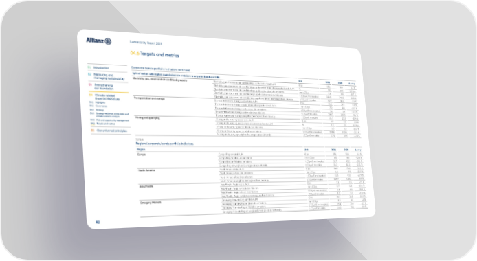 Sustainability Report 2021 04.6 Targets and metrics 01 Introduction Corporate bonds portfolio indicators continued Split of sectors with highest owned absolute emissions in corporate bonds portfolio Unit 2021 2020 Δ y-o-y 02 Measuring and Electricity, gas, steam and air conditioning supply Electricity, gas, steam and air conditioning supply sector total AuM € bn 18.6 18.4 1.3 % managing sustainability Electricity, gas, steam and air conditioning supply sector share of corporate bonds AuM % 9.0 10.0 -1.0 %-p 03 Strengthening Electricity, gas, steam and air conditioning supply sector absolute emissions mn t CO₂e 5.4 6.4 -15.7 % our foundation Electricity, gas, steam and air conditioning supply sector relative emissions t CO₂e/€ mn invested 288.0 346.0 -16.8 % 04 Climate-related Electricity, gas, steam and air conditioning supply weighted average carbon intensity t CO₂e/€ mn sales 80.9 82.2 -1.5 % financial disclosure Transportation and storage Transportation and storage sector total AuM € bn 14.5 14.9 -3.1 % 04.1 Highlights Transportation and storage sector share of corporate bonds AuM mn t CO₂e 7.0 8.0 -12.5 % 04.2 Governance Transportation and storage sector absolute emissions t CO₂e/€ mn invested 1.6 1.8 -12.3 % 04.3 Strategy Transportation and storage sector relative emissions t CO₂e/€ mn sales 108.9 120.5 -9.6 % 04.4 Strategy resilience, stress-tests and Transportation and storage weighted average carbon intensity t CO₂e/€ mn sales 21.7 27.3 -20.4 % climate scenario analysis Mining and quarrying Mining and quarrying sector total AuM € bn 4.0 3.9 2.0 % 04.5 Risk and opportunity management Mining and quarrying sector share of corporate bonds AuM % 2.0 2.0 0.0 %-p 04.6 Targets and metrics Mining and quarrying sector absolute emissions mn t CO₂e 1.0 1.2 -20.3 % 05 Our universal principles Mining and quarrying sector relative emissions t CO₂e/€ mn invested 243.8 313.5 -22.2 % Mining and quarrying weighted average carbon intensity t CO₂e/€ mn sales 11.9 13.6 -12.6 % TCFD-5 Regional corporate bonds portfolio indicators Region Unit 2021 2020 Δ y-o-y Europe Europe Region total AuM € bn 87.6 93.5 -6.3 % Europe Region Absolute emissions mn t CO₂e 6.5 8.3 -22.0 % Europe Region Relative emissions t CO₂e/€ mn invested 32.7 43.2 -24.1 % Europe Region weighted average carbon intensity t CO₂e/€ mn sales 56.3 63.3 -11.1 % North America North America total AuM € bn 86.8 78.2 11.0 % North America Absolute emissions mn t CO₂e 6.2 7.9 -20.7 % North America Relative emissions t CO₂e/€ mn invested 31.6 41.0 -22.9 % North America weighted average carbon intensity t CO₂e/€ mn sales 107.7 118.2 -8.9 % Asia/Pacific Asia/Pacific Region total AuM € bn 7.1 7.3 -2.9 % Asia/Pacific Region Absolute emissions mn t CO₂e 0.7 0.8 -13.1 % Asia/Pacific Region Relative emissions t CO₂e/€ mn invested 3.4 4.0 -15.5 % Asia/Pacific Region weighted average carbon intensity t CO₂e/€ mn sales 5.2 7.2 -27.9 % Emerging Markets Emerging Markets Region total AuM € bn 16.1 13.2 22.2 % Emerging Markets Region Absolute emissions mn t CO₂e 3.0 3.0 1.3 % Emerging Markets Region Relative emissions t CO₂e/€ mn invested 15.4 15.6 -1.5 % Emerging Markets Region weighted average carbon intensity t CO₂e/€ mn sales 21.2 19.5 8.9 % 92