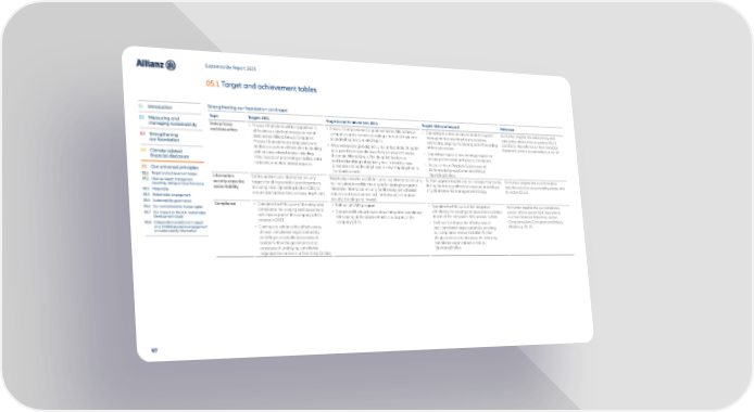 Sustainability Report 2021 05.1 Target and achievement tables 01 Introduction Strengthening our foundation continued Topic Targets 2021 Progress and Achievements 2021 Targets 2022 and beyond Reference 02 Measuring and Data privacy • Privacy Champions will be appointed in • Privacy Champions were appointed across Allianz Group • Deploying new data privacy controls for supplier For further insights into data privacy and managing sustainability and data ethics all business units that process personal companies and are now dedicating a portion of their time management concerning the pre-selection, data ethics, please refer to sections 03.2.1 03 Str engthening data across Allianz Group companies. to deal with privacy-related topics. contracting, ongoing monitoring, and off-boarding and 03.2.2. Also refer to our Non-Financial our foundation Privacy Champions are employees who • We developed a global privacy risk and controls ‘blueprint’ of data processors. Statement, section Social matters, p. 64–67. dedicate a portion of their time to dealing to support local compliance efforts with the APS across • Deploying a rigorous new training program for 04 Climate-r elated with privacy-related topics, including the entire Allianz Group. The blueprint provides a privacy professionals and privacy champions. financial disclosure PIAs, records of processing activities, data tool for identifying data privacy risks in local business • Rollout of the AI Practical Guidance to all incidents, and data access requests. processes and addressing those risks by mapping them to EU Renewal Agenda Committee (RACo) 05 Our universal principles standard controls. Operating Entities. 05.1 Target and achievement tables Information Define and include information security Target objectives for all OEs included key information security Further upgrade targets and risk indicator monitoring, For further insights into our information 05.2 How we report: transparent security executive targets for all responsible board members, risk indicators in addition to targets for strategic programs linking them to quantified risk exposure and roll-out security executive accountability, please refer reporting, ratings and performance accountability including local Operating Entities (OEs) to related to information security. Additionally, a mechanism of global cyber-risk management strategy. to section 03.2.3. 05.3 Materiality ensure appropriate focus on securing Allianz. was devised to ensure a direct link between information 05.4 Stakeholder engagement security standing and reward. 05.5 Sustainability governance Compliance • Complete the fifth cycle of the integrated • Roll-out of CARE program. • Complete the fifth cycle of the integrated For further insights into our compliance, 05.6 Our commitment to human rights compliance risk scoping and assessment • Completed the fourth cycle of our integrated compliance compliance risk scoping and assessment activities please refer to section 03.4. Also refer to 05.7 Our impact on the U.N. Sustainable activities as part of the company’s IRCS risk scoping and assessment activities as part of the as part of the company’s IRCS process in 2021. our Non-Financial Statement, section Development Goals process in 2021. Compliance/Anti-Corruption and Bribery 05.8 Independent practitioner’s report company’s IRCS. • Continue to enhance the effectiveness of on a limited assurance engagement • Continue to enhance the effectiveness local compliance organizations by enriching Matters, p. 70–71. on sustainability information of local compliance organizations by our compliance reviews, to bolster further enriching our compliance reviews, to the governance and processes of underlying bolster further the governance and compliance organizations across our processes of underlying compliance Operating Entities. organizations across our Operating Entities. 97
