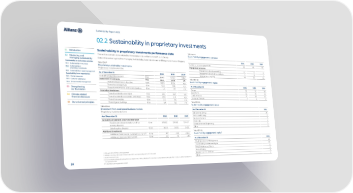 Sustainability Report 2021 02.2 Sustainability in proprietary investments 01 Introduction Sustainability in proprietary investments performance data Table ESG-9 This section contains data related to the sustainability performance of Allianz Group. Sustainability engagement: overview 02 Measuring and Data in this section is part of the Managing Sustainability, Sustainable Insurer and Responsible Investor Chapters. 2021 2020 2019 managing sustainability Sustainability in our business activities Table ESG-7 Number of active engagements 61 68 49 02.1 Sustainability in insurance Proprietary sustainable investments Engagement outcomes 02.2 Sustainability in Proprietary Investments € bn Engagement closed successfully 21 3 4 proprietary investments Engagement closed with restrictions 2 8 1 02.3 Sustainability in asset management 1 2 As of December 31 2021 2020 2019 Engagement on-going 38 57 44 Sustainability in our organization 3 3 3 02.4 Human resources Global Portfolio ESG screened € bn 849.2 835.0 795.0 Table ESG-10 02.5 Customer satisfaction Sustainable investments € bn 123.1 127.0 n/a Sustainability engagement: region 02.6 Environmental management Thereof environmental objectives € bn 109.9 115.6 n/a Thereof social objectives € bn 12.0 10.8 n/a As of December 31 2021 2020 2019 03 Strengthening Thereof environmental and social objectives € bn 1.1 0.5 n/a Europe 15 17 18 our foundation Asset class breakdown Asia Pacific 22 25 12 04 Climate-related Thereof sustainable sovereigns € bn 84.1 92.7 n/a North America 17 20 15 financial disclosure Thereof sustainable corporates and others € bn 25.5 21.9 n/a Emerging Markets 7 6 4 Thereof renewables € bn 7.0 6.9 n/a 05 Our universal principles Thereof green buildings € bn 6.4 5.6 n/a Table ESG-11 Sustainability engagement: sector Table ESG-8 Divestment from coal-based business models As of December 31 2021 Proprietary Investments € mn Oil, Gas and Energy 34 As of December 31 2021 2020 2019 Metals and Mining 7 Cumulative divestment since November 2015 Steel and Cement 7 Fixed income investments to run-off or € mn 5,983.0 5,983.0 5,942.7 Chemicals 3 already disposed Construction and Engineering 5 Listed equities divested € mn 347.5 347.5 340.5 Other 5 Additional divestments Table ESG-12 4 5 Additional fixed income investments to run-off € mn 0.0 40.3 236.0 Sustainability engagement: topics 4 Additional listed equities divested € mn 0.0 7.0 14.0 As of December 31 2021 CO2 Emissions and Management 48 Health, Safety and Human Rights 17 Toxic Emissions and Waste 6 1 KPIs were not part of the audit engagement. Product Safety 2 2 Definition was newly introduced in financial year 2021, no comparison figures for 2019 disclosed. Biodiversity and Land Use 4 3 Based on economic view. Other 3 4 Given the extensive Freeze of positions that could breach new ambitious thresholds for coal based business models coming into effect in 2023, no additional divestments 24 are reported for 2021. 5 Multiple topics per engagement possible.