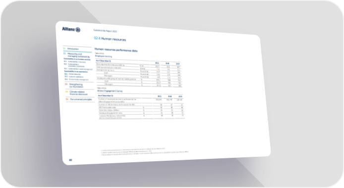 Sustainability Report 2021 02.4 Human resources 01 Introduction Human resources performance data 02 Measuring and Table HR-11 managing sustainability Employee training Sustainability in our business activities As of December 31 2021 2020 2019 02.1 Sustainability in insurance 1 02.2 Sustainability in Total expenses for employee training € mn 102.9 63.1 84.7 proprietary investments Training expenses per employee €/empl 716 442 613 02.3 Sustainability in asset management 2 Average training hours hours/empl 34.7 20.7 24.0 Sustainability in our organization Staff hours/empl 33.3 20.5 24.8 02.4 Human resources Managers hours/empl 43.5 21.6 26.6 02.5 Customer satisfaction 3 Employees undergoing at least one training session % 103.1 78.8 75.2 02.6 Environmental management 3 Staff % 102.9 78.0 73.5 3 03 Strengthening Managers % 104.5 83.7 84.8 our foundation Table HR-12 04 Climate-related Allianz Engagement Survey financial disclosure As of December 31 2021 2020 2019 05 Our universal principles Number of employees invited to participate in the 132,126 132,593 123,505 Allianz Engagement Survey (AES) Number of OEs invited to participate in the AES 64 67 62 AES Participation rate % 82 85 84 Work Well Index+ (WWi+) % 69 70 66 Employee Engagement Index % 76 78 72 Inclusive Meritocracy Index (IMIX) % 78 78 73 IMIX board target 75% by year-end 2024 1 Increase in training expenses driven by methodological adjustment towards industry practice to include overhead expenses. 2 Last year reported as training days per employee; definition adjusted to market practice in 2021. 3 The percentage of employees with at least one training can be higher than 100 percent due to the reporting period calculation methodology incl. employee in- and outflows. 40