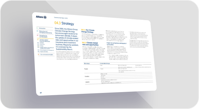 Sustainability Report 2021 04.3 Strategy 01 Introduction Since 2005, the Allianz Group 04.3.1 Our Climate Risks and opportunities also result from the • As a large-scale institutional investor with Climate Change Strategy Change Strategy cross-sectoral structural change stemming significant stakes in various economies, 02 Measuring and from the transition to a low-carbon economy. companies, infrastructure and real estate that managing sustainability has encouraged solutions for The strategy focuses on three areas: Anticipating These transition risks include the impacts of might be affected by the physical impact of the risks of a changing climate; Caring for the changes in climate policy, technology and market climate change and the transition to a low- 03 Strengthening tomorrow’s climate. It steers climate-vulnerable; and Enabling the low-carbon sentiment, and impact thereof on the market carbon economy. our foundation the uptake of climate-related transition. These strategy pillars are described in value of financial assets, as well as impact The largest risks in our risk profile are market risks, risks and opportunities in our chapter 01.5.3 of this report. resulting from climate change litigation. especially equity risk, credit and credit spread 04 Climate-related Impact on our business and impact of risks driven by assets backing long-term liabilities. financial disclosure insurance and investment 04.3.2 Climate-related P&C premium and reserve risks, resulting from 04.1 Highlights risks and opportunities our business natural and man-made catastrophes and from 04.2 Governance business. Regularly updated, Allianz Group is exposed to risks that are claims, uncertainty must be considered. 04.3 Strategy it is overseen by the Climate change will materially affect global influenced by climate change in a multitude 04.4 Strategy resilience, stress-tests and economies and Allianz’s lines of business. The risks of ways. We are particularly impacted in two climate scenario analysis Sustainability Board. and opportunities emerging today will increase key ways through our core business activities, 04.5 Risk and opportunity management over the mid- and long-term. They include acute both of which can influence the ability of assets 04.6 Targets and metrics Our 2021 materiality assessment confirmed the and chronic physical impacts on property and to generate long-term value: results of 2019 in finding climate change to be human health such as warming temperatures, 05 Our universal principles Allianz’s top sustainability topic according to extreme weather events, rising sea levels, • As an insurer providing insurance policies, e.g. stakeholder views on the importance of topics to intensifying heatwaves, droughts and potential covering health impacts, property damage or our business and to society. See section 05.2 for changes in vector-borne diseases. litigation claims, and through changes in the more details on the materiality assessment. sectors and business models we underwrite. Risk category Climate-related changes Acute First-order hazard/risk Second-order risk Like extreme weather, heat stress, etc. Like soil moisture deficit, coastal erosion etc. Physical Chronic First-order hazard/risk Like changing temperature patterns or rising sea levels, etc. Policy and legal Transition Technology Market Reputation Litigation for (enabling) GHG/emissions/ Litigation failure to mitigate, etc. Litigation for insufficient disclosure, adaptation, etc. 69