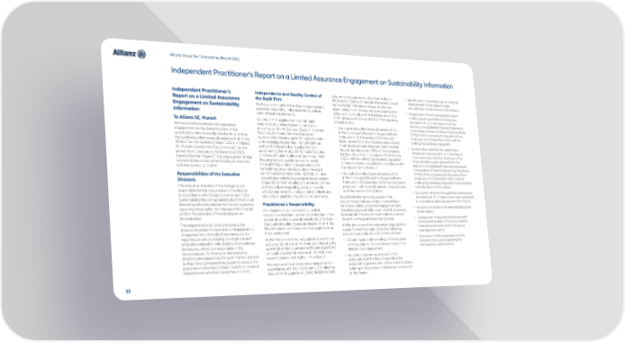 Independent Practitioner’s Report on a Limited Assurance Engagement on Sustainability Information Independent Practitioner’s Report on a Limited Assurance Engagement on Sustainability Information To Allianz SE, Munich We have performed a limited assurance engagement on the determination of the quantitative disclosures denoted with ‘√’ and on the qualitative disclosures denoted with ‘#’ in the ‘Allianz Tax Transparency Report 2021’ of Allianz SE, Munich (hereinafter ‘the Company’), for the period from 1 January to 31 December 2021 (hereinafter the ‘Report’). Our engagement in this context relates solely to the disclosures denoted with the symbol ‘√’ and ‘#’. Responsibilities of the Executive Directors The executive directors of the Company are responsible for the preparation of the Report in accordance with the principles stated in the Sustainability Reporting Standards of the Global Reporting Initiative relevant for tax transparency reporting (hereinafter the ‘relevant GRI-Criteria’) and for the selection of the disclosures to be evaluated. This responsibility of Company’s executive directors includes the selection and application of appropriate methods of tax transparency reporting as well as making assumptions and estimates related to individual tax transparency disclosures, which are reasonable in the circumstances. Furthermore, the executive directors are responsible for such internal controls as they have considered necessary to enable the preparation of a Report that is free from material misstatement whether due to fraud or error. Independence and Quality Control of the Audit Firm We have complied with the German professional provisions regarding independence as well as other ethical requirements. Our audit firm applies the national legal requirements and professional standards – in particular the Professional Code for German Public Auditors and German Chartered Auditors (‘Berufssatzung für Wirtschaftsprüfer und vereidigte Buchprüfer’: ‘BS WP/vBP’) as well as the Standard on Quality Control 1 published by the Institut der Wirtschaftsprüfer (Institute of Public Auditors in Germany; IDW): Requirements to quality control for audit firms (IDW Qualitätssicherungsstandard 1: Anforderungen an die Qualitätssicherung in der Wirtschaftsprüferpraxis - IDW QS 1) – and accordingly maintains a comprehensive system of quality control including documented policies and procedures regarding compliance with ethical requirements, professional standards and applicable legal and regulatory requirements. Practitioner ́s Responsibility Our responsibility is to express a limited assurance conclusion on the determination of the quantitative disclosures denoted with ‘√’ and on the qualitative disclosures denoted with ‘#’ in the Report based on the assurance engagement we have performed. Within the scope of our engagement we did not evaluate the financial information underlying the quantitative disclosures in the Report or perform an audit on external sources of information or expert opinions, referred to in the Report. We conducted our assurance engagement in accordance with the International Standard on Assurance Engagements (ISAE) 3000 (Revised): Assurance Engagements other than Audits or Reviews of Historical Financial Information, issued by the IAASB. This Standard requires that we plan and perform the assurance engagement to allow us to conclude with limited assurance that nothing has come to our attention that causes us to believe that: • the quantitative disclosures denoted with ‘√’ in the Company’s Report for the period from 1 January to 31 December 2021 have not been derived from the statutory consolidated financial statements (International Financial Reporting Standards (IFRS)) of the Company for the period from 1 January to 31 December 2021 and the underlying bookkeeping system or have not been calculated in accordance with the relevant GRI-criteria, or • the qualitative disclosures denoted with ‘#’ in the Company’s Report for the period from 1 January to 31 December 2021 have not been prepared, in all material aspects, in accordance with the relevant GRI-Criteria. In a limited assurance engagement the assurance procedures are less in extent than for a reasonable assurance engagement and therefore a substantially lower level of assurance is obtained. The assurance procedures selected depend on the practitioner’s judgment. Within the scope of our assurance engagement, we performed amongst others the following assurance procedures and further activities: • Obtaining an understanding of the structure of the sustainability organization and of the stakeholder engagement. • Inquiries of personnel involved in the preparation of the Report regarding the preparation process, the internal control system relating to this process and selected disclosures in the Report. • Identification of the likely risks of material misstatement of the Report under consideration of the relevant GRI-Criteria. • Comparison of the financial information underlying the quantitative disclosures denoted with ‘√’ in the Report with the statutory consolidated financial statements (International Financial Reporting Standards (IFRS)) of the Company for the period from 1 January to 31 December 2021 and the underlying bookkeeping system. • Examination whether the quantitative disclosures denoted with ‘√’ in the Report have been calculated on the basis of the financial information derived from the statutory consolidated financial statements (International Financial Reporting Standards (IFRS)) of the Company for the period from 1 January to 31 December 2021 and the underlying bookkeeping system in accordance with the relevant GRI-criteria. • Evaluation whether the qualitative disclosures denoted with ‘#’ in Report have been prepared in accordance with the relevant GRI-Criteria. • Analytical evaluation of selected discl