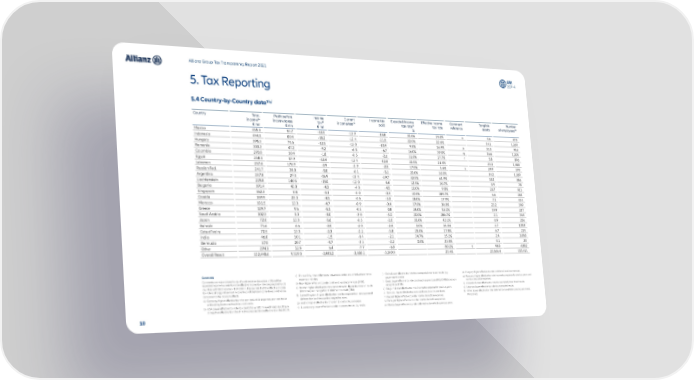 Country Total income 16 € mn Profit before income taxes € mn Income tax 17 € mn Current income tax 18 Income tax paid Expected income tax rate 19 % Effective income tax rate Comment reference Tangible assets Number of employees 20 Mexico 455.1 54.7 -10.5 -13.9 -14.8 30.0% 19.2% o 4.6 473 Indonesia 444.1 80.4 -18.2 -12.4 -21.5 22.0% 22.6% 14.1 1,269 Hungary 395.3 71.6 -12.1 -12.0 -10.9 9.0% 16.9% p 31.3 953 Romania 303.3 47.2 -9.2 -6.8 -6.7 16.0% 19.5% q 16.6 1,205 Colombia 293.8 10.4 -1.8 -0.5 -2.6 31.0% 17.7% r 5.8 896 Egypt 258.1 57.9 -12.4 -12.4 -12.4 22.5% 21.4% 23.3 1,488 Lebanon 257.6 178.9 -2.9 -2.9 -2.5 17.0% 1.6% s 29.9 199 Russian Fed. 241.7 31.8 -5.8 -6.1 -5.1 20.0% 18.3% 14.2 1,189 Argentina 237.8 27.3 -16.9 -15.4 -29.7 32.5% 61.9% 10.2 386 Liechtenstein 225.8 140.5 -15.0 -12.0 4.4 12.5% 10.7% 0.9 78 Bulgaria 191.4 43.8 -4.3 -4.8 -4.5 10.0% 9.8% 20.7 923 Singapore 162.3 0.8 -3.1 -3.0 -0.9 10.0% 389.7% 6.6 281 Croatia 159.9 23.0 -4.1 -4.6 -3.3 18.0% 17.9% 7.1 414 Morocco 131.5 13.0 -4.7 -0.9 -0.4 37.0% 36.0% 23.2 399 Greece 129.7 9.6 -5.1 -0.3 0.8 24.0% 53.2% 19.9 227 Saudi Arabia 102.3 1.0 -3.0 -3.0 -3.0 20.0% 286.7% 2.1 344 Japan 72.0 13.0 -5.6 -6.5 -2.0 30.0% 43.1% 0.9 256 Bahrain 71.6 6.6 -2.0 -2.0 -2.4 0.0% 31.0% 2.7 1,553 Cote d’Ivoire 70.5 13.0 -2.3 -2.2 -3.8 25.0% 17.8% 6.7 215 India 46.8 10.1 -1.5 -1.4 -2.1 34.7% 15.1% 2.4 3,058 Bermuda 37.0 20.7 -4.7 -3.3 -2.2 0.0% 23.0% 0.1 20 Other 294.1 12.8 6.4 -7.7 -6.3 -50.2% t 98.0 4,802 Overall Result 132,448.6 9,519.8 -2,415.2 -3,626.2 -3,049.9 25.4% 23,566.4 155,411 5.4 Country-by-Country data 15√ 5. Tax Reporting Comments Comments on major drivers for significant deviation (absolute > 3%p) of the expected income tax rate from the effective income tax rate are provided for all countries with total income > EUR 250mn. Please note that the effective income tax rate is strongly influenced in case the profit before income taxes is rather low compared to the absolute effects. a) Germany: Higher effective tax rate: non deductible expenses, non creditable withholding taxes and trade tax add backs. b) USA: Lower effective tax rate: tax credits for windfarm investments, resulting in a negative effective tax rate of -9.8% compared to an effective tax rate of 21%. GRI 207–4 c) France: Only minor differences between expected and effective income tax expense and rates. d) Italy: Higher effective tax rate: additional local income taxes (IRAP). e) Ireland: Higher effective tax rate: application of different tax rates on results (branches), non recognition of deferred tax assets (DTA). f) United Kingdom: Higher effective tax rate: tax expense from revaluation of deferred tax liabilities due to changed tax rates. g) Austria: Higher effective tax rate: non tax deductible expenses. h) Luxembourg: Lower effective tax rate: tax exempted equity results. i) China: Lower effective tax rate: tax exempted/lower taxed results (e.g. government bonds). j) Brazil: Lower effective tax rate: additional income taxes (PIS/COFINS) and non recognition of DTA. k) Belgium: Lower effective tax rate: income tax expense for previous years. l) Slovakia: Higher effective tax rate: additional local income taxes. m) Poland: Higher effective tax rate: non tax deductible expenses. n) Portugal: Higher effective tax rate: non tax deductible expenses. o) Mexico: Lower effective tax rate: deferred tax benefits for previous years. p) Hungary: Higher effective tax rate: additional local income taxes. q) Romania: Higher effective tax rate: income tax expense for previous years and non tax deductible expenses. r) Colombia: Lower effective tax rate: tax exempted/lower taxed results. s) Lebanon: Lower effective tax rate: tax exempted results. t) Other: Lower effective tax rate: deferred tax benefits for previous years (esp. Philippines). Allianz Group Tax Transparency Report 2021 10