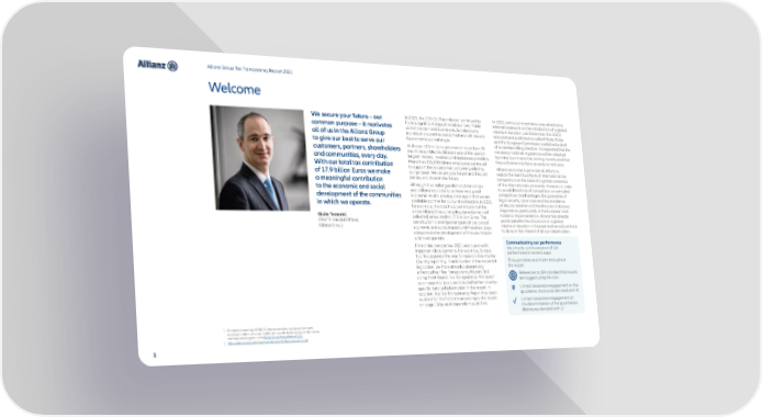 In 2021, the COVID-19 pandemic 1 continued to have a significant impact on all our lives. Public administration and businesses, but also every individual around the world, had and still have to face enormous challenges. With over 100 million customers in more than 70 countries worldwide, Allianz is one of the world’s largest insurers, investors and assistance providers. More than 155,000 Allianz employees continued to support these customers last year guided by our purpose ‘We secure your future’ and they will continue to do so in the future. Although the challenges did not diminish last year, Allianz was able to achieve very good economic results, proving once again that we are a reliable partner for all our stakeholders. In 2021, for example, the total fiscal contribution of the entire Allianz Group, including taxes borne and collected, amounted to 17.9 billion Euros. This contribution is an important part of our overall economic and social impact and therefore plays a key role in the development of the countries in which we operate. From a tax perspective, 2021 was a year with important developments. For example, Europe has finally paved the way for a public Country-by- Country reporting. In anticipation of the expected legislation, we have already substantially enhanced our Tax Transparency Report. Still using the B-Team’s Tax Transparency Principles 2 as an essential basis we included further country- specific detailed information in the report. In addition, this Tax Transparency Report has been audited for the first time according to the report on page 13 by an independent audit firm. In 2021, particular importance was attached to international work on the introduction of a global minimum taxation. Last December, the OECD adopted and published so-called Model Rules and the European Commission published a draft of a corresponding directive. It is expected that the necessary national regulations will be adopted by many countries in the coming months and that they will come into force as early as next year. Allianz welcomes in principle all efforts to reduce the harmful effects of international tax competition on the basis of a global consensus of the international community. However, in order to avoid distortions of competition or one-sided competitive disadvantages, the guarantee of legal security, clear rules and the avoidance of double taxation will therefore be of decisive importance, particularly in the European and national implementation. Allianz has already participated in the discussion on a global minimum taxation in the past and we will continue to do so in the interest of all our stakeholders. Communicating our performance We simplify communication of our performance in several ways: Through tables and charts throughout the report. References to GRI standard disclosures are tagged using this icon. # Limited assurance engagement on the qualitative disclosures denoted with ‘#’. √ Limited assurance engagement on the determination of the quantitative disclosures denoted with ‘√’. 1 For details concerning COVID-19 impacts related to business environment, employee matters, consumer matters, etc. we refer to the respective information and explanations given in the Allianz Group Annual Report 2021. 2 https://bteam.org/assets/reports/A-New-Bar-for-Responsible-Tax.pdf Welcome We secure your future – our common purpose – it motivates all of us in the Allianz Group to give our best to serve our customers, partners, shareholders and communities, every day. With our total tax contribution of 17.9 billion Euros we make a meaningful contribution to the economic and social development of the communities in which we operate. Giulio Terzariol Chief Financial Officer, Allianz Group Allianz Group Tax Transparency Report 2021 1