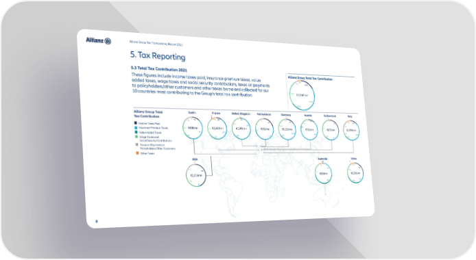 Other 602 460 493 486 175 €2,261mn 45 Australia 136 €838mn 227 389 177 56 (11) USA 980 75 720 418 €2,216mn 23 Italy 246 883 175 184 340 167 €1,996mn Switzerland 77 6 78 15 92 €272mn 3 Austria 75 483 122 40 €726mn 7 Germany 736 2,226 448 1,575 11 157 €5,153mn Netherlands 61 28 143 27 41 €302mn 1 United Kingdom 22 599 118 347 €1,092mn 6 France 203 1,037 458 673 198 €2,603mn 35 Spain 8 €488mn 59 211 105 58 48 Income Taxes Paid Value Added Taxes Insurance Premium Taxes Wage Taxes and Social Security Contributions Taxes on Payments to Policyholders/Other Customers Other Taxes A llianz Gr oup T otal T ax C ontribution 5. Tax Reporting 5.3 Total Tax Contribution 2021 These figures include income taxes paid, insurance premium taxes, value added taxes, wage taxes and social security contributions, taxes on payments to policyholders/other customers and other taxes borne and collected for our 10 countries most contributing to the Group’s total tax contribution. € 17,947 mn 6,422 3,050 2,221 1,080 4,523 651 A llianz Gr oup T otal T ax C ontribution Allianz Group Tax Transparency Report 2021 8