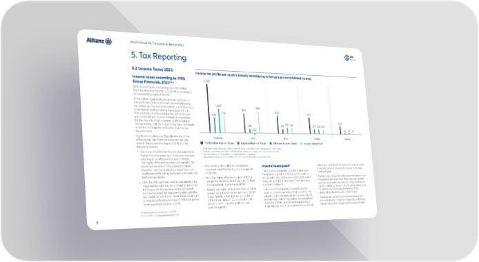 5. Tax Reporting 5.2 Income Taxes 2021 Income taxes according to IFRS Group financials 2021 13 √ With income taxes amounting to 2,415 million Euro the effective tax rate is at 25.4% compared to an expected tax rate of 24.3% 14 . In the following graphic, we give an overview of the profit before income taxes, expected income tax, effective income tax based on our IFRS Group financials as well as income taxes paid for our five countries mostly contributing to the Group’s pre-consolidated income. A respective overview for the majority of all countries and the Allianz Group in total, can be found in the table provided in section 5.4 together with other Country-by- Country data. Significant (> absolute 3%p) deviations of the effective tax rate from the expected tax rate arise in these countries especially due to the following reasons: • Germany: the effective income tax expense is higher than the expected income tax expense resulting in an effective tax rate of 49.2%. The higher effective tax rate compared to the expected tax rate of 31% is predominately based on non-tax deductible expenses, non- creditable withholding taxes and add backs for trade tax purposes. • USA: the 2021 pre-tax income was significantly impacted by expenses for a litigation provision for Structured Alpha. As such the expected income tax expense was overcompensated by tax credits for windfarm investments resulting in a negative effective tax rate of -9.8% compared to an expected tax rate of 21%. • France: only minor differences between expected and effective income tax expense and rates. • Italy: the higher effective tax rate of 32.3% compared to the expected tax rate of 24% is driven by local income taxes (IRAP). • Ireland: the higher effective tax rate of 18.5% compared to the expected tax rate of 12.5% is significantly driven by the application of different tax rates on branch results and losses for which no deferred tax assets were recognized. Income taxes paid √ The income tax expense of 2,415 million Euro recorded in our 2021 IFRS Group financials is not equal to the income tax paid in 2021 which amounts to 3,050 million Euro. This is due to a number of reasons: The income tax expense is based upon the accrual accounting concept that allows for the allocation of a tax expense to the same period in which the underlying taxable item is realized. Contrary to that, income taxes paid during a financial year may include payments or refunds relating to prior financial years, and may exclude final payments or refunds that occur in the next financial year. Furthermore, the profit before income taxes in our financial statements may differ from the taxable income reported in tax returns. These differences result in deferred taxes in the financial statements to reflect any future taxable events (2021: deferred tax benefit 1,221 million Euro). Additionally, certain income taxes have to be booked directly in equity in case the underlying results have been recognized in equity as well. 1 Profit before income taxes based on IFRS consolidated figures without intercompany profit/loss/reinsurance elimination. 2 Expected income taxes based on IFRS profit before taxes multiplied with country specific corporate income tax rate. 3 Income tax expense according to IAS 12 (current and deferred income taxes). 4 Amount of income taxes paid during the fiscal year 2021 (including payments for previous fiscal years). 13 Reporting period covered 01.01. – 31.12.2021. 14 As published in our Annual Report 2021 (p. 164). Ireland USA France G e rma n y Income tax profile per country (mostly contributing to Group’s pre-consolidated income) 2,128 660 1,047 736 362 45 67 61 884 186 (86) 980 810 194 262 246 753 214 208 203 Profit before Income Taxes 1 Expected Income Taxes 2 Effective Income Taxes 3 Italy Income Taxes Paid 4 GRI 207–4 Allianz Group Tax Transparency Report 2021 7